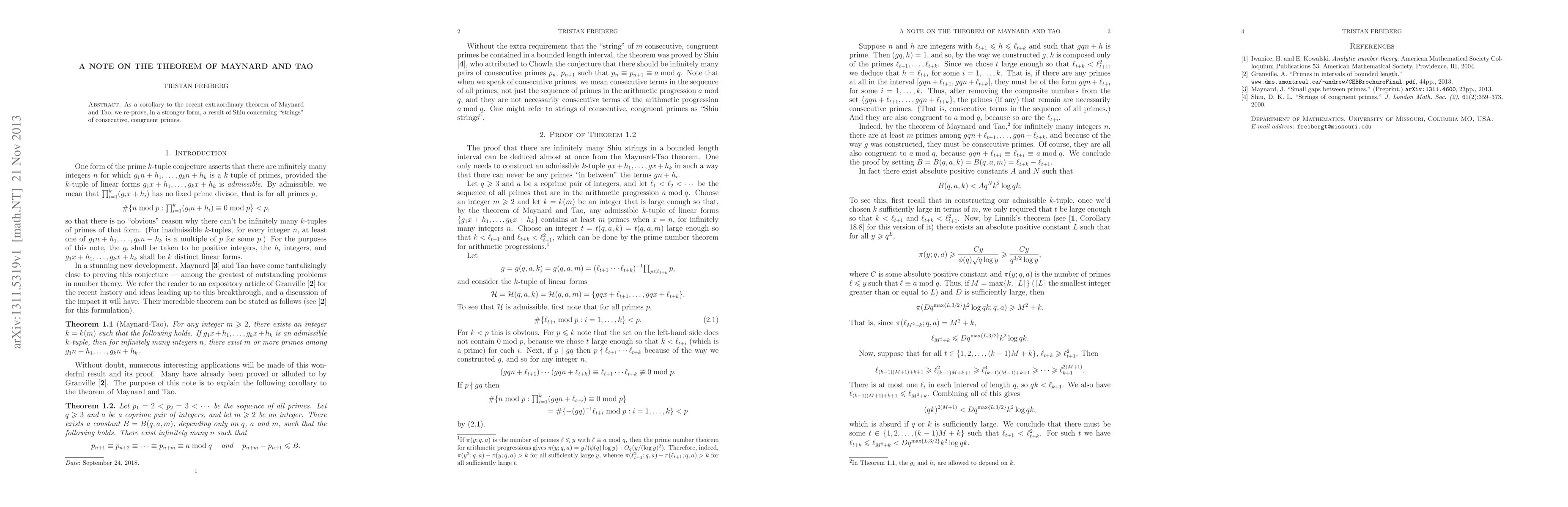 As a corollary to the recent extraordinary theorem of Maynard and Tao, we re-prove, in a stronger form, a result of Shiu concerning "strings" of consecutive, congruent primes.