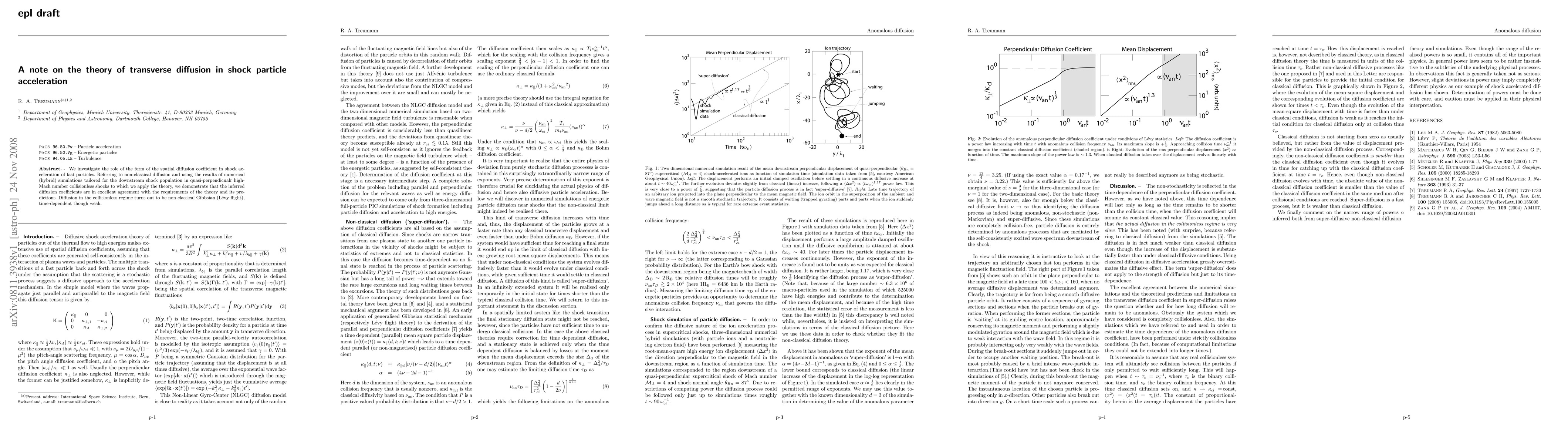 We investigate the role of the form of the spatial diffusion coefficient in shock acceleration of fast particles. Referring to non-classical diffusion and using the results of numerical (hybrid) simulations tailored for the downstream shock population in quasi-perpendicualr high-Mach number collisionless shocks to which we apply the theory, we demonstrate that the inferred diffusion coefficients are in excellent agreement with the requirements of the theory and its predictions. Diffusion in the collisionless regime turns out to be non-classical Gibbsian (L\'evy flight), time-dependent though weak.