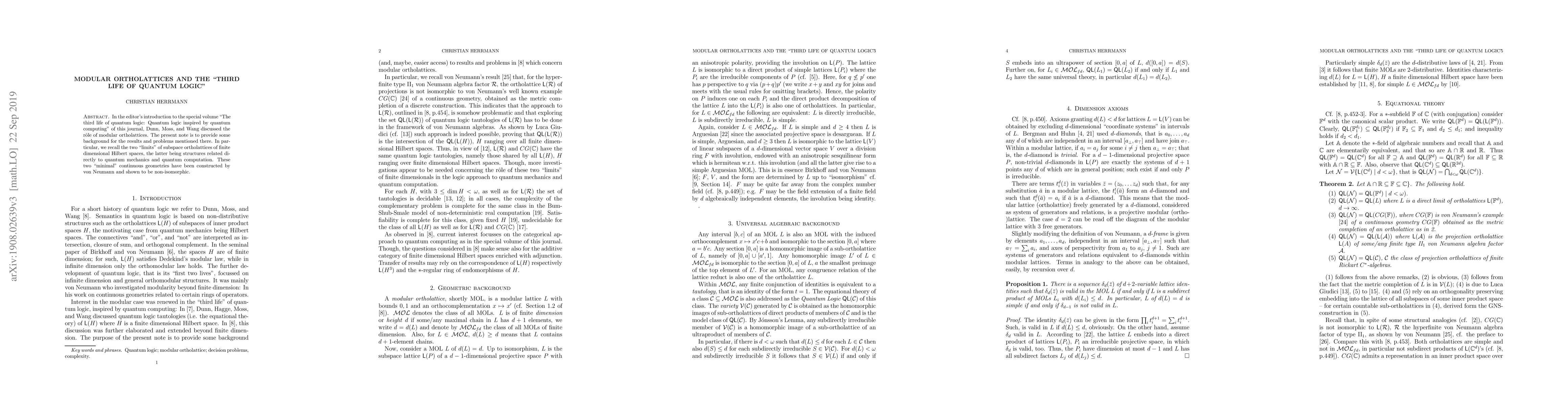 The purpose of this note is to discuss some of the questions raised by Dunn, J. Michael; Moss, Lawrence S.; Wang, Zhenghan in Editors' introduction: the third life of quantum logic: quantum logic inspired by quantum computing.