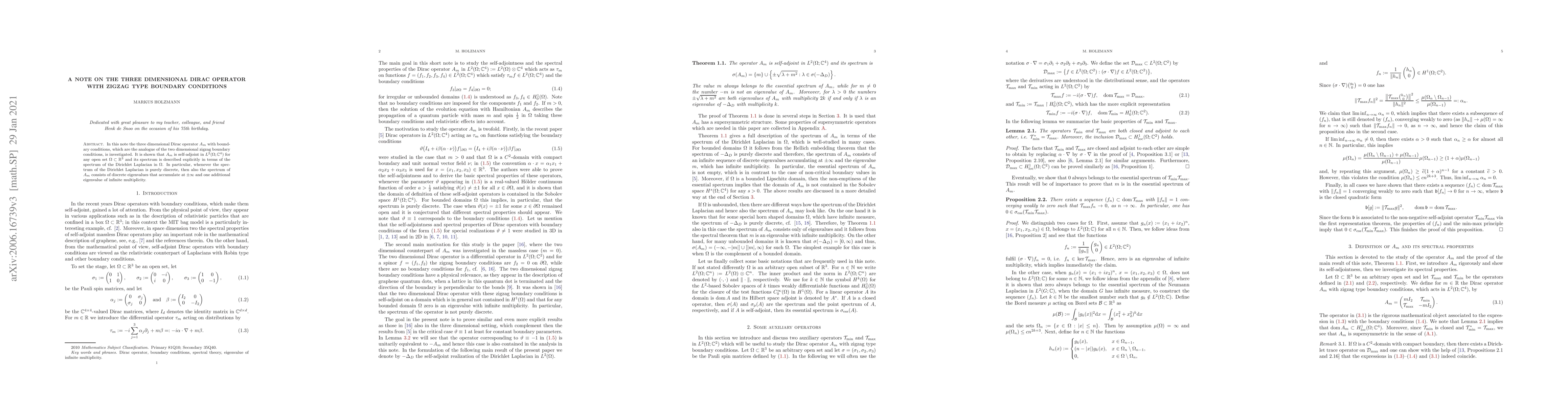 This paper examines the three-dimensional Dirac operator with zigzag-type boundary conditions, proving it's self-adjoint in L^2(Ω;ℂ^4) for any open set Ω in ℝ^3. The spectrum of this operator is explicitly described in relation to the Dirichlet Laplacian's spectrum, with discrete eigenvalues accumulating at ±∞ and one eigenvalue of infinite multiplicity when the Dirichlet Laplacian's spectrum is purely discrete.