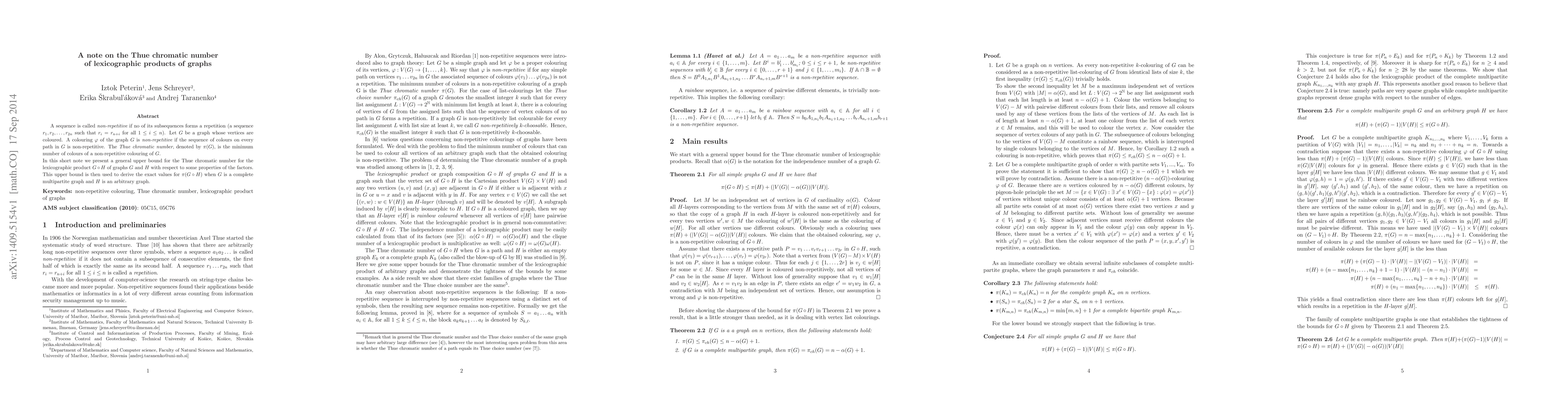 A sequence is called non-repetitive if no of its subsequences forms a repetition (a sequence $r_1,r_2,\dots,r_{2n}$ such that $r_i=r_{n+i}$ for all $1\leq i \leq n$). Let $G$ be a graph whose vertices are coloured. A colouring $\varphi$ of the graph $G$ is non-repetitive if the sequence of colours on every path in $G$ is non-repetitive. The Thue chromatic number, denoted by $\pi (G)$, is the minimum number of colours of a non-repetitive colouring of $G$. In this short note we present a general upper bound for the Thue chromatic number for the lexicographic product $G\circ H$ of graphs $G$ and $H$ with respect to some properties of the factors. This upper bound is then used to derive the exact values for $\pi(G\circ H)$ when $G$ is a complete multipartite graph and $H$ is an arbitrary graph.