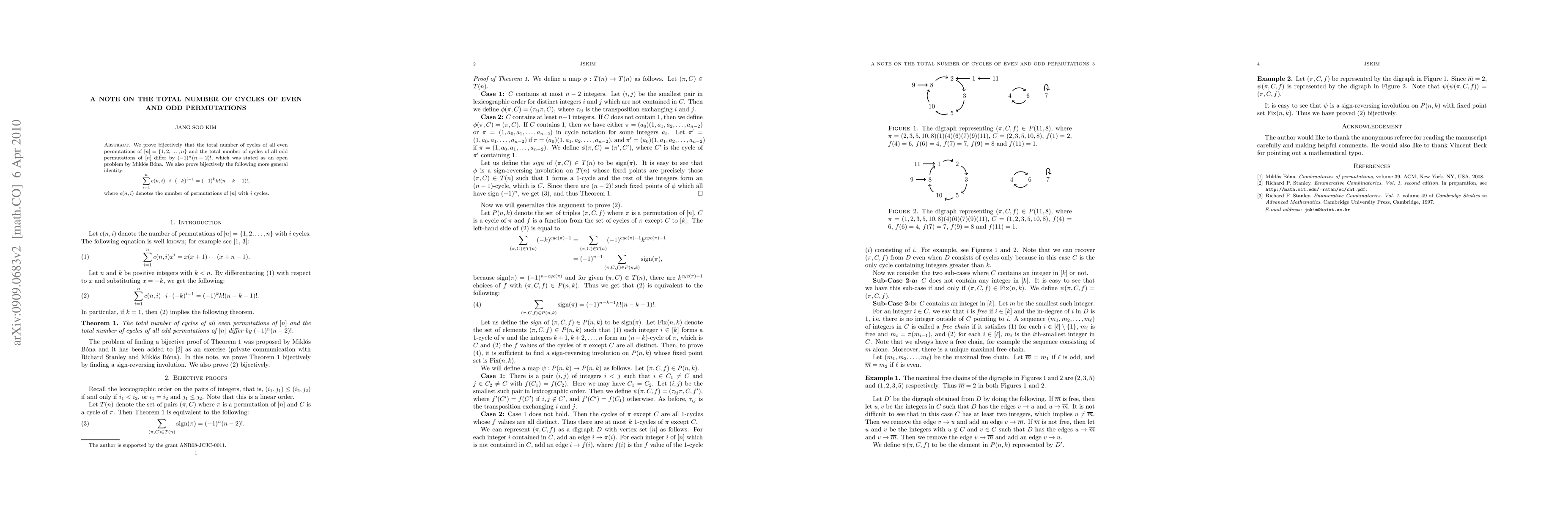 We prove bijectively that the total number of cycles of all even permutations of $[n]=\{1,2,...,n\}$ and the total number of cycles of all odd permutations of $[n]$ differ by $(-1)^n(n-2)!$, which was stated as an open problem by Mikl\'{o}s B\'{o}na. We also prove bijectively the following more general identity: $$\sum_{i=1}^n c(n,i)\cdot i \cdot (-k)^{i-1} = (-1)^k k! (n-k-1)!,$$ where $c(n,i)$ denotes the number of permutations of $[n]$ with $i$ cycles.