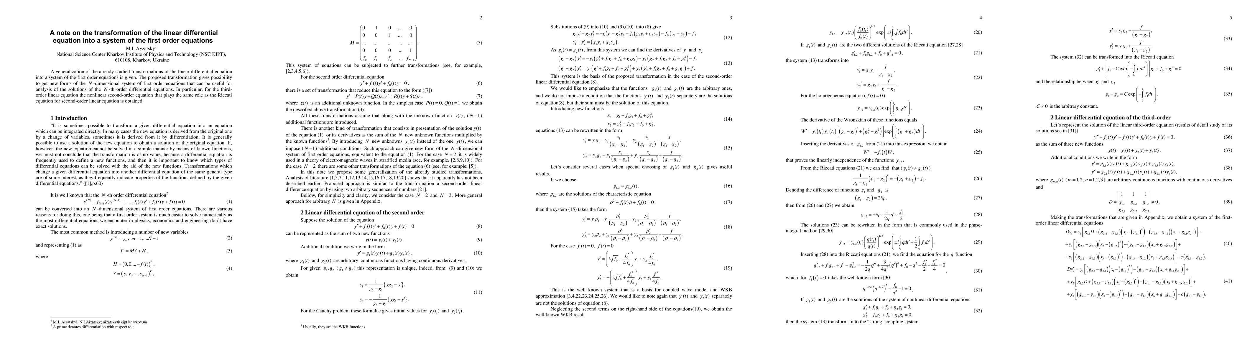Summary: This paper generalizes the transformation of linear differential equations into systems of first-order equations, proposing a new method that yields useful forms for analyzing N-th order differential equations, including a nonlinear second-order equation for third-order linear equations analogous to the Riccati equation.