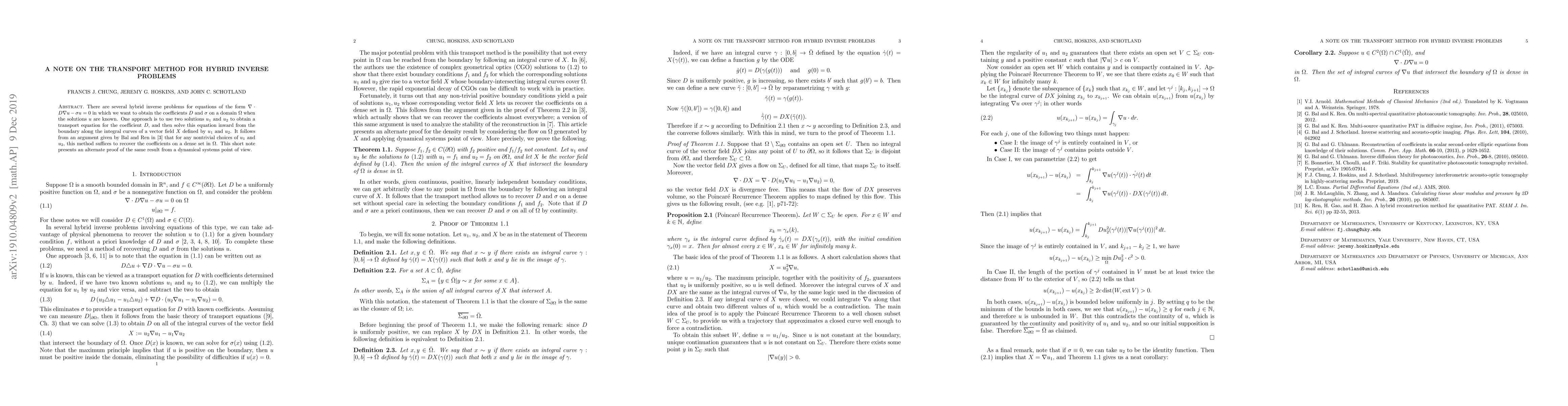 There are several hybrid inverse problems for equations of the form $\nabla \cdot D \nabla u - \sigma u = 0$ in which we want to obtain the coefficients $D$ and $\sigma$ on a domain $\Omega$ when the solutions $u$ are known. One approach is to use two solutions $u_1$ and $u_2$ to obtain a transport equation for the coefficient $D$, and then solve this equation inward from the boundary along the integral curves of a vector field $X$ defined by $u_1$ and $u_2$. It follows from an argument of Guillaume Bal and Kui Ren that for any nontrivial choices of $u_1$ and $u_2$, this method suffices to recover the coefficients on a dense set in $\Omega$. This short note presents an alternate proof of the same result from a dynamical systems point of view.