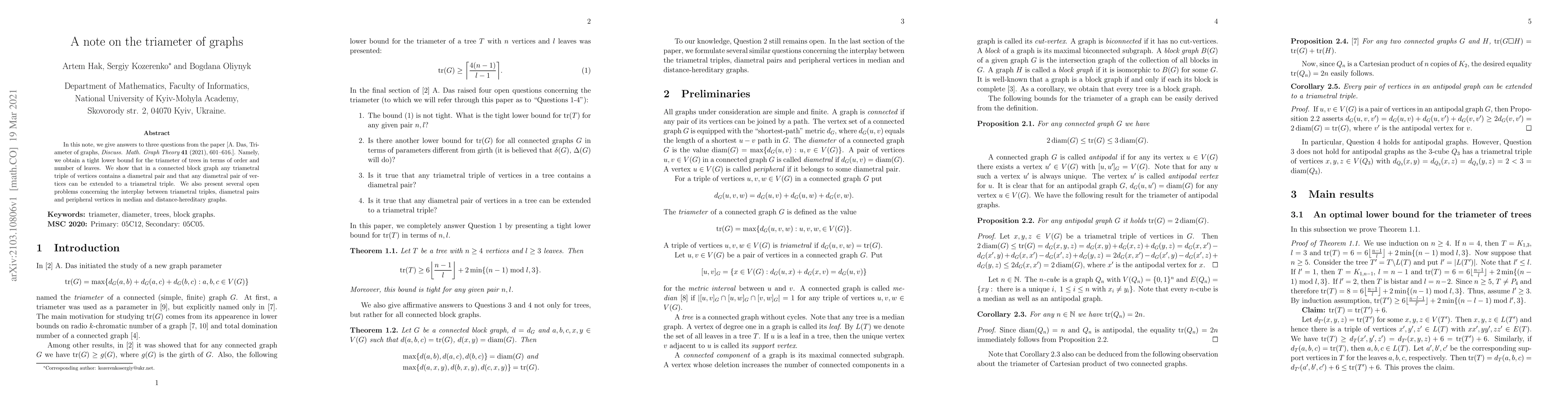 In this note, we give answers to three questions from the paper [A. Das, Triameter of graphs, Discuss. Math. Graph Theory, 41 (2021), 601--616]. Namely, we obtain a tight lower bound for the triameter of trees in terms of order and number of leaves. We show that in a connected block graph any triametral triple of vertices contains a diametral pair and that any diametral pair of vertices can be extended to a triametral triple. We also present several open problems concerning the interplay between triametral triples, diametral pairs and peripheral vertices in median and distance-hereditary graphs.
