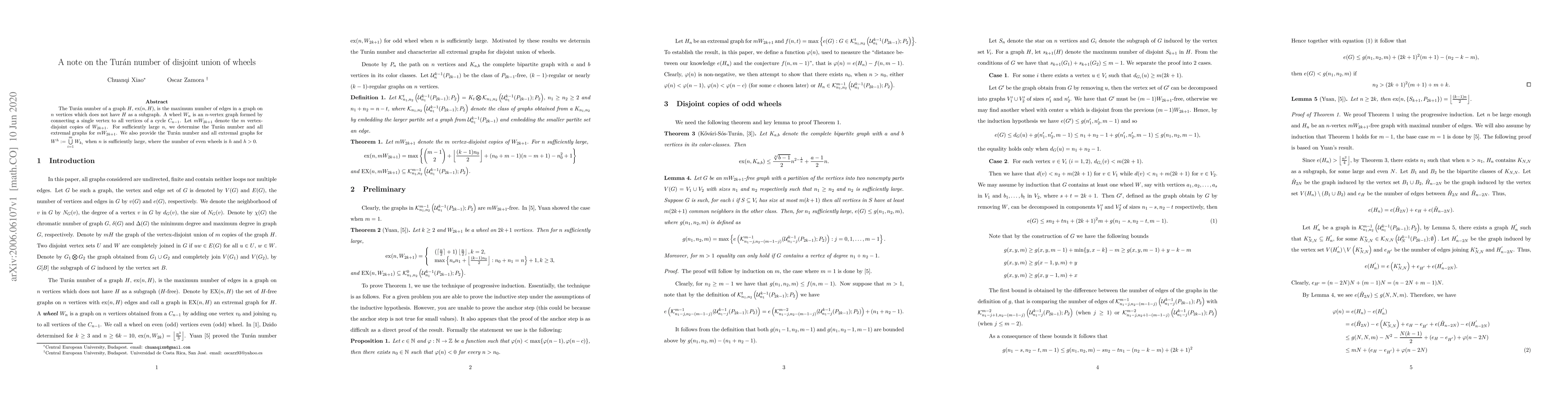 The Tur\'an number of a graph $H$, $\text{ex}(n,H)$, is the maximum number of edges in a graph on $n$ vertices which does not have $H$ as a subgraph. A wheel $W_n$ is an $n$-vertex graph formed by connecting a single vertex to all vertices of a cycle $C_{n-1}$. Let $mW_{2k+1}$ denote the $m$ vertex-disjoint copies of $W_{2k+1}$. For sufficiently large $n$, we determine the Tur\'an number and all extremal graphs for $mW_{2k+1}$. We also provide the Tur\'an number and all extremal graphs for $W^{h}:=\bigcup\limits^m_{i=1}W_{k_i}$ when $n$ is sufficiently large, where the number of even wheels is $h$ and $h>0$.