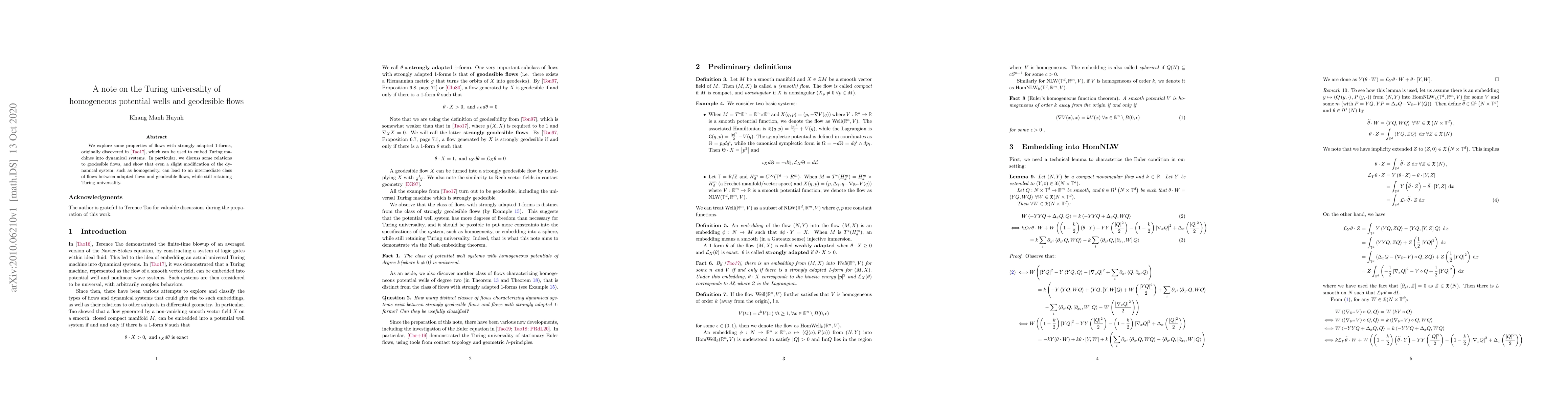 We explore some properties of flows with strongly adapted 1-forms, originally discovered in (Tao 2017), which can be used to embed Turing machines into dynamical systems. In particular, we discuss some relations to geodesible flows, and show that even a slight modification of the dynamical system, such as homogeneity, can lead to an intermediate class of flows between adapted flows and geodesible flows, while still retaining Turing universality.