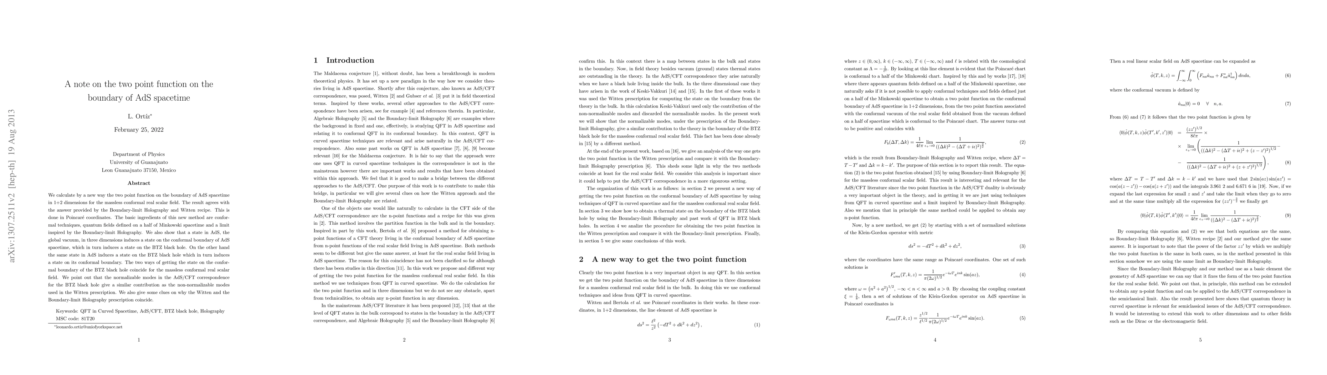 This paper presents a novel method to calculate the two-point function on the boundary of AdS spacetime in 1+2 dimensions for a massless conformal real scalar field, using conformal techniques and quantum fields defined on Minkowski spacetime. The results align with existing Boundary-limit Holography and Witten prescriptions, and it explores the relationship between states in AdS and the BTZ black hole, showing their equivalence.