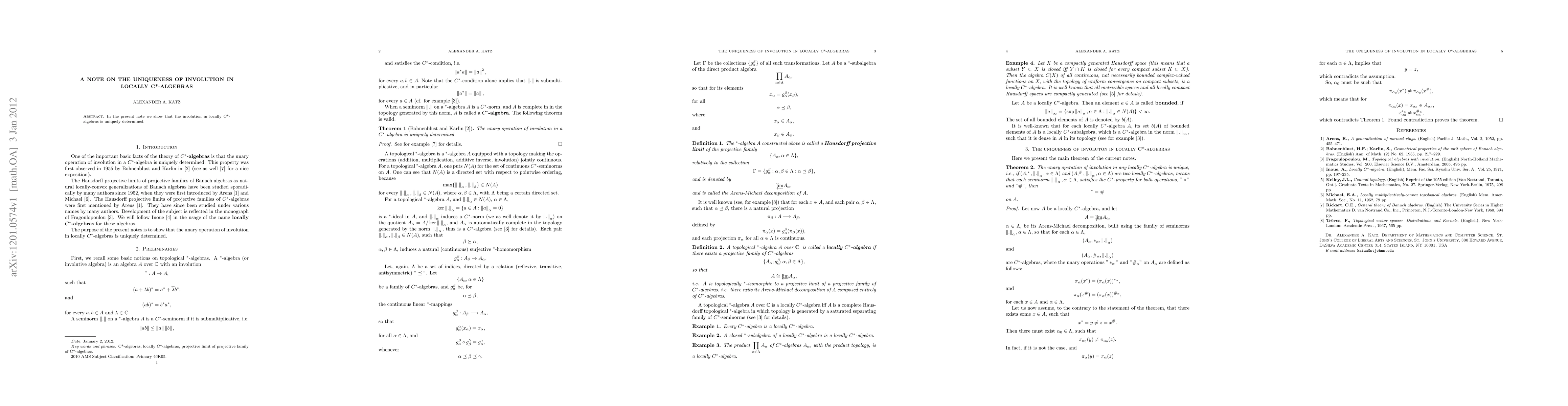 The paper proves that in locally C*-algebras, the involution (a mathematical operation analogous to complex conjugate) is unique, meaning there is only one such operation that satisfies the necessary properties.