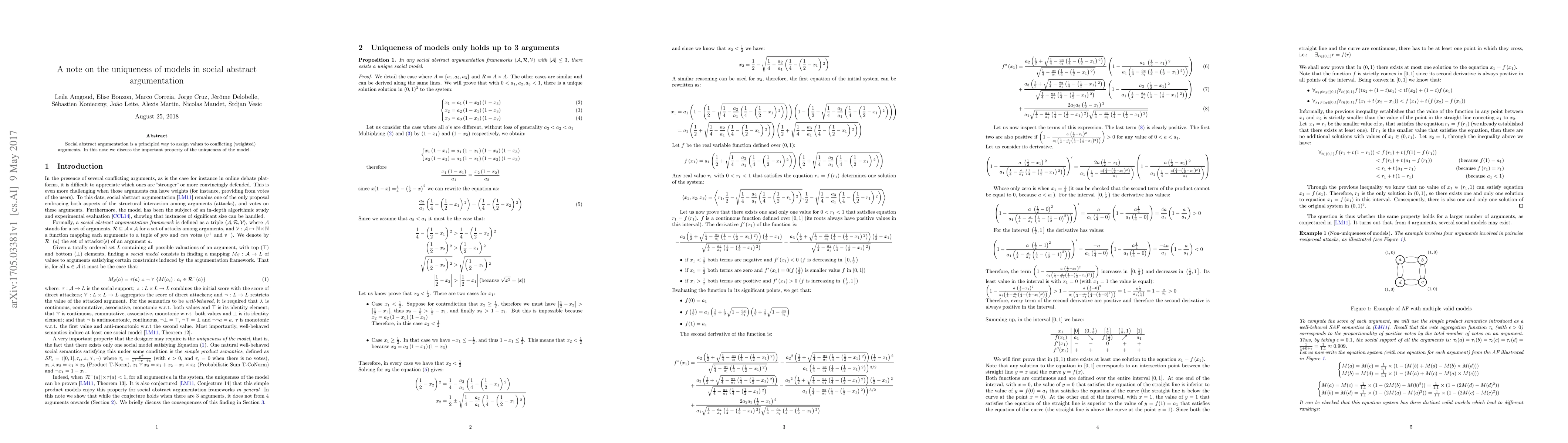 Social abstract argumentation is a principled way to assign values to conflicting (weighted) arguments. In this note we discuss the important property of the uniqueness of the model.