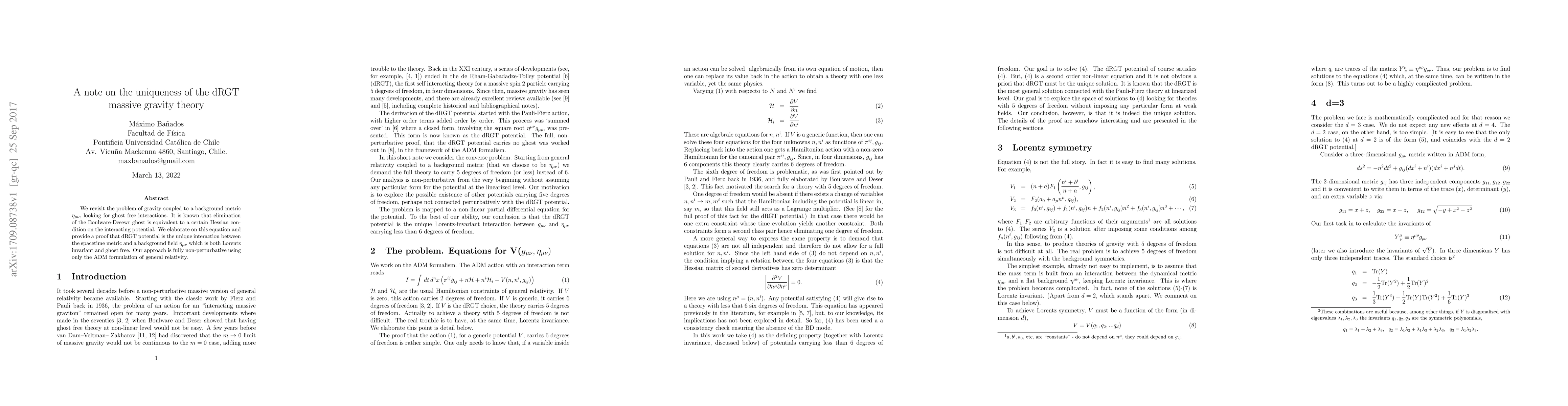 We revisit the problem of gravity coupled to a background metric $\eta_{\mu\nu}$, looking for ghost free interactions. It is known that elimination of the Boulware-Desewr ghost is equivalent to a certain Hessian condition on the interacting potential. We elaborate on this equation and provide a proof that dRGT potential is the unique interaction between the spacetime metric and a background field $\eta_{\mu\nu}$ which is both Lorentz invariant and ghost free. Our approach is fully non-perturbative using only the ADM formulation of general relativity.