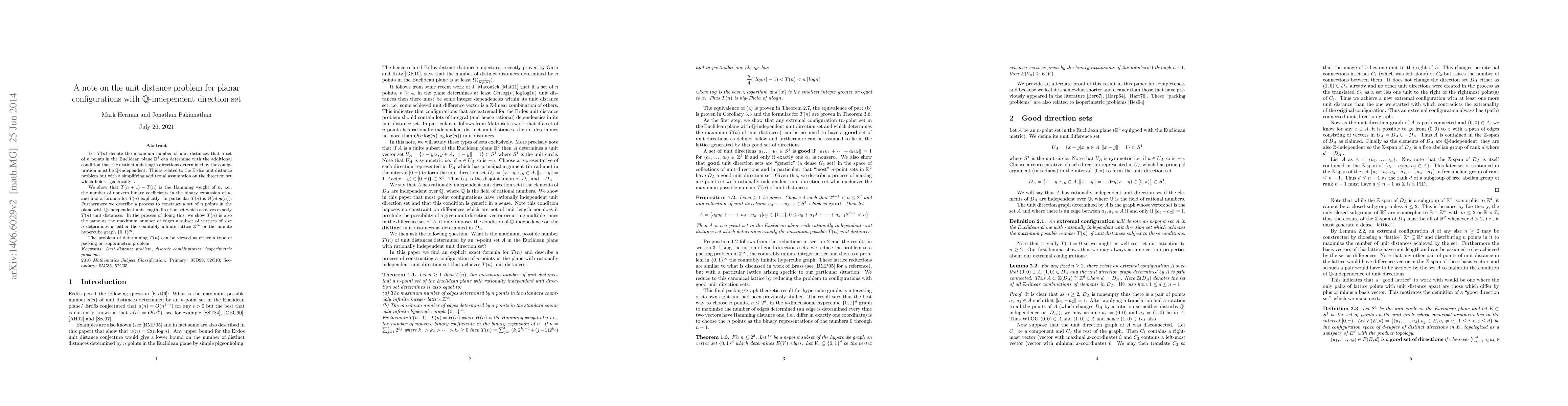 Let $T(n)$ denote the maximum number of unit distances that a set of $n$ points in the Euclidean plane $\mathbb{R}^2$ can determine with the additional condition that the distinct unit length directions determined by the configuration must be $\mathbb{Q}$-independent. This is related to the Erdos unit distance problem but with a simplifying additional assumption on the direction set which holds "generically". We show that $T(n+1)-T(n)$ is the Hamming weight of $n$, i.e., the number of nonzero binary coefficients in the binary expansion of $n$, and find a formula for $T(n)$ explicitly. In particular $T(n)$ is $\Theta(n log(n))$. Furthermore we describe a process to construct a set of $n$ points in the plane with $\mathbb{Q}$-independent unit length direction set which achieves exactly $T(n)$ unit distances. In the process of doing this, we show $T(n)$ is also the same as the maximum number of edges a subset of vertices of size $n$ determines in either the countably infinite lattice $\mathbb{Z}^{\infty}$ or the infinite hypercube graph $\{0,1\}^{\infty}$. The problem of determining T(n) can be viewed as either a type of packing or isoperimetric problem.