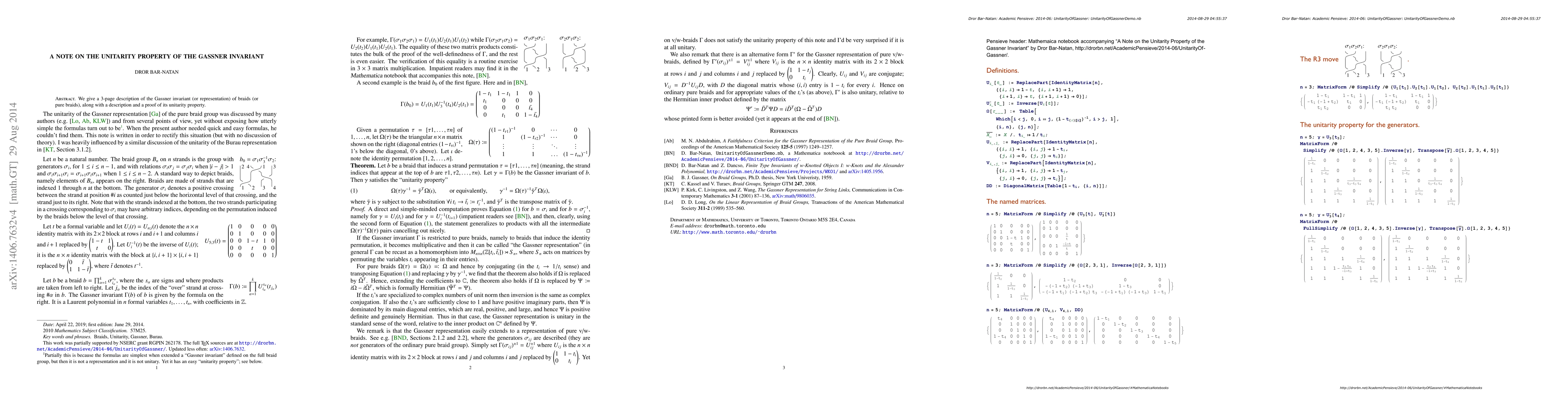 We give a 3-page description of the Gassner invariant / representation of braids / pure braids, along with a description and a proof of its unitarity property.