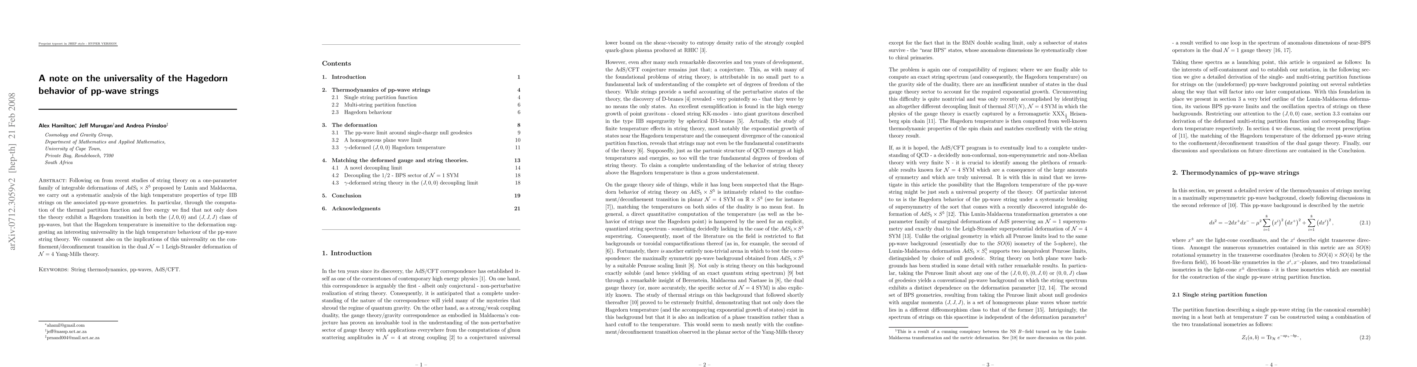 This paper investigates high-temperature properties of type IIB strings on pp-wave geometries, finding a Hagedorn transition in both $(J,0,0)$ and $(J,J,J)$ classes, with the Hagedorn temperature being independent of deformations, indicating a universality in pp-wave string theory's high-temperature behavior. Implications for the confinement/deconfinement transition in the dual $\mathcal{N}=1$ Leigh-Strassler deformation of ${\cal N}=4$ Yang-Mills theory are also discussed.