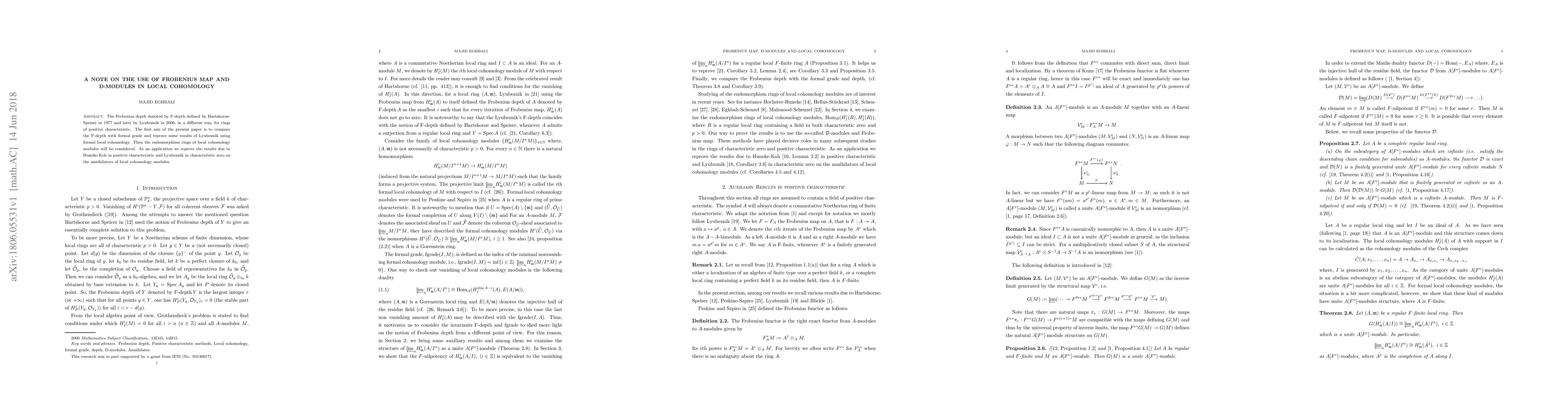 The Frobenius depth denoted by F-depth defined by Hartshorne-Speiser in 1977 and later by Lyubeznik in 2006, in a different way, for rings of positive characteristic. The first aim of the present paper is to compare the F-depth with formal grade and reprove some results of Lyubeznik using formal local cohomology. Then the endomorphism rings of local cohomology modules will be considered. As an application, we reprove the results due to Huneke-Koh in positive characteristic and Lyubeznik in characteristic zero on the annihilators of local cohomology modules.