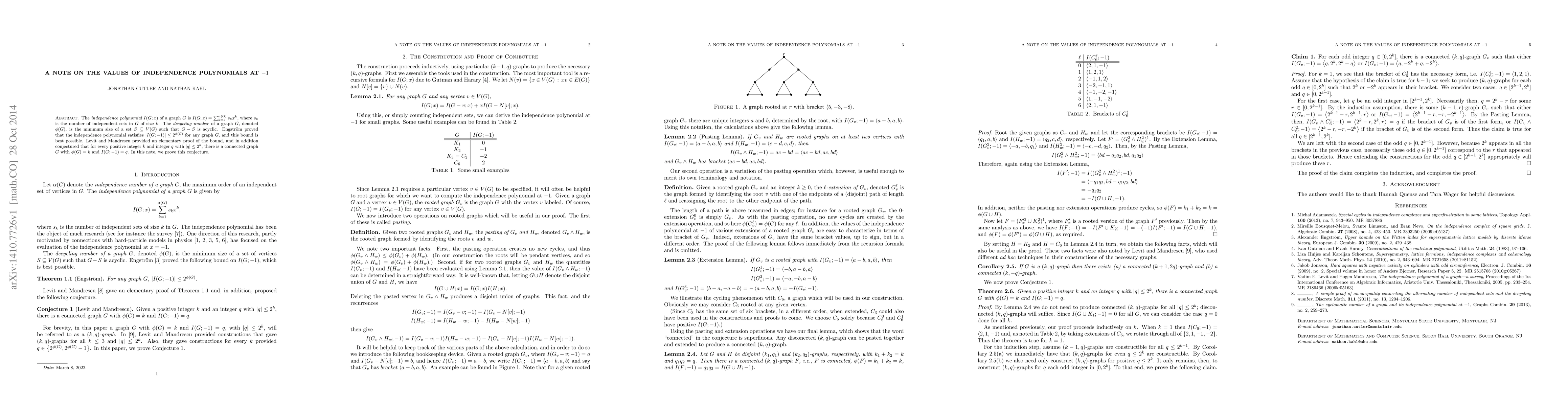 The independence polynomial $I(G;x)$ of a graph $G$ is $I(G;x)=\sum_{k=1}^{\alpha(G)} s_k x^k$, where $s_k$ is the number of independent sets in $G$ of size $k$. The decycling number of a graph $G$, denoted $\phi(G)$, is the minimum size of a set $S\subseteq V(G)$ such that $G-S$ is acyclic. Engstr\"om proved that the independence polynomial satisfies $|I(G;-1)| \leq 2^{\phi(G)}$ for any graph $G$, and this bound is best possible. Levit and Mandrescu provided an elementary proof of the bound, and in addition conjectured that for every positive integer $k$ and integer $q$ with $|q|\leq 2^k$, there is a connected graph $G$ with $\phi(G)=k$ and $I(G;-1)=q$. In this note, we prove this conjecture.
