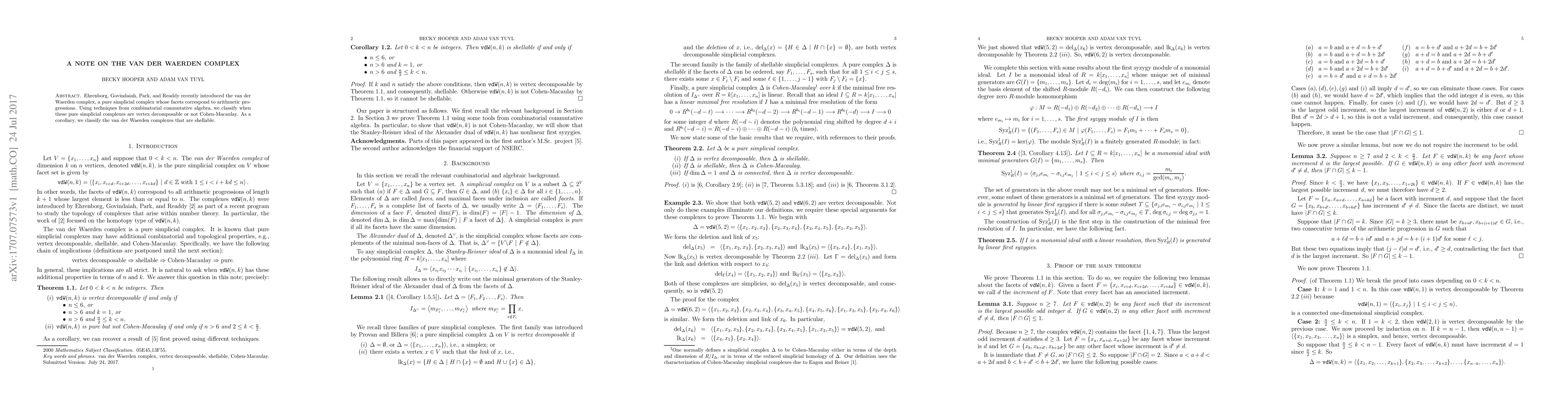 Introduced a classification theorem for vertex decomposability and Cohen-Macaulayness of van der Waerden complexes using combinatorial commutative algebra techniques.