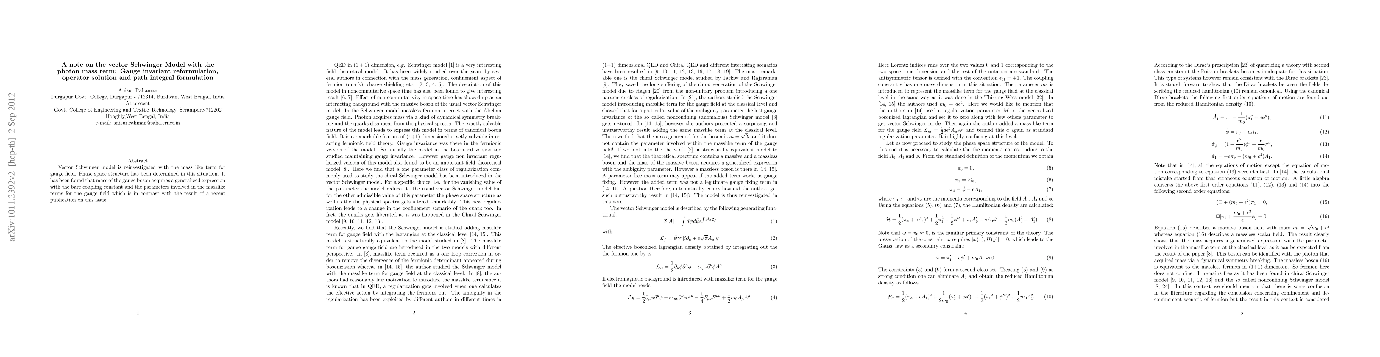 Vector Schwinger model is reinvestigated with the mass like term for gauge field. Phase space structure has been determined in this situation. It has been found that mass of the gauge boson acquires a generalized expression with the bare coupling constant and the parameters involved in the masslike terms for the gauge field which is in contrast with the result of a recent publication on this issue.