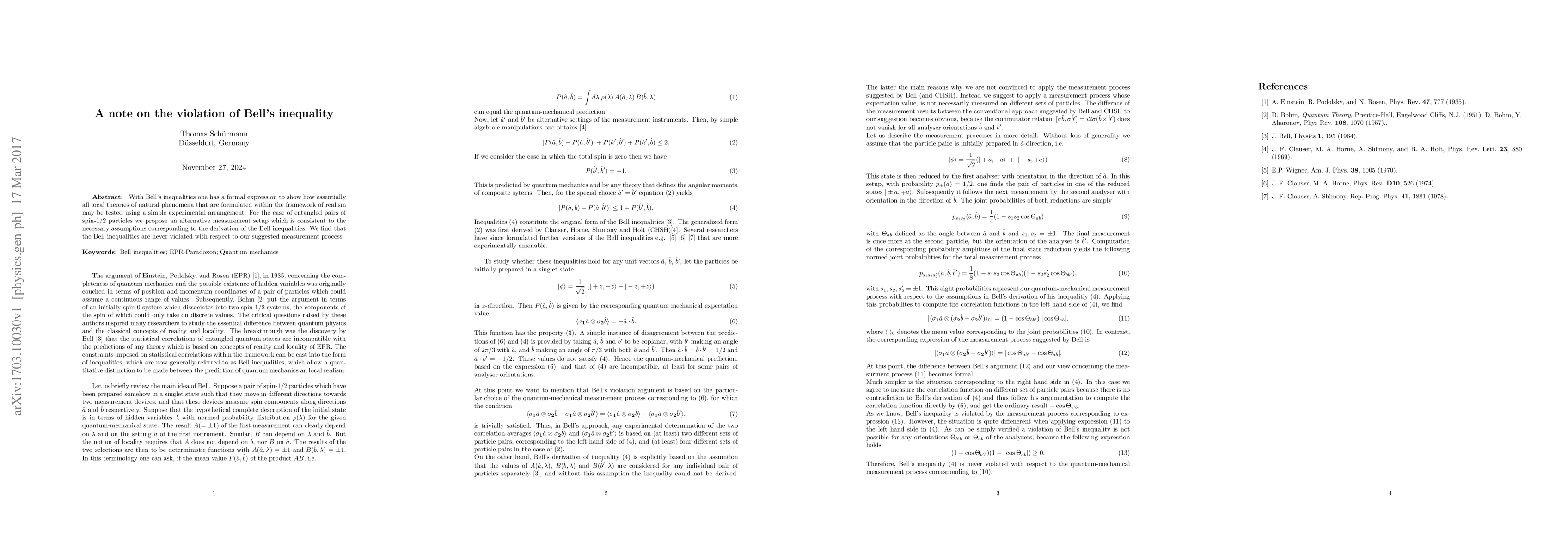 With Bell's inequalities one has a formal expression to show how essentially all local theories of natural phenomena that are formulated within the framework of realism may be tested using a simple experimental arrangement. For the case of entangled pairs of spin-1/2 particles we propose an alternative measurement setup which is consistent to the necessary assumptions corresponding to the derivation of the Bell inequalities. We find that the Bell inequalities are never violated with respect to our suggested measurement process.