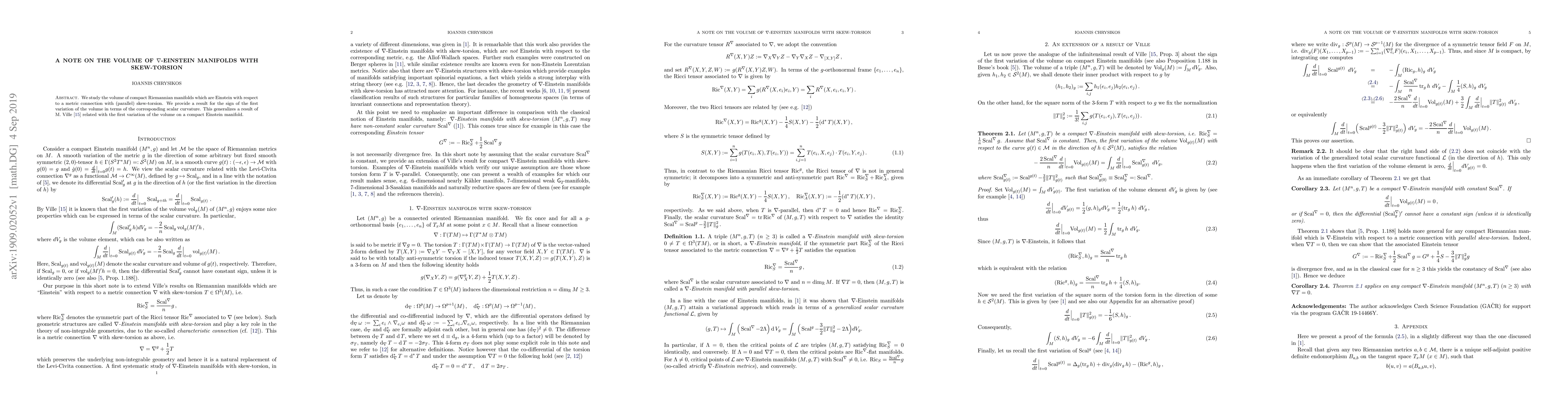 This paper investigates the volume of compact Riemannian manifolds that are Einstein under a metric connection with skew-torsion, providing a result on the sign of the first variation of the volume in relation to the scalar curvature, thereby generalizing a prior result by M. Ville.