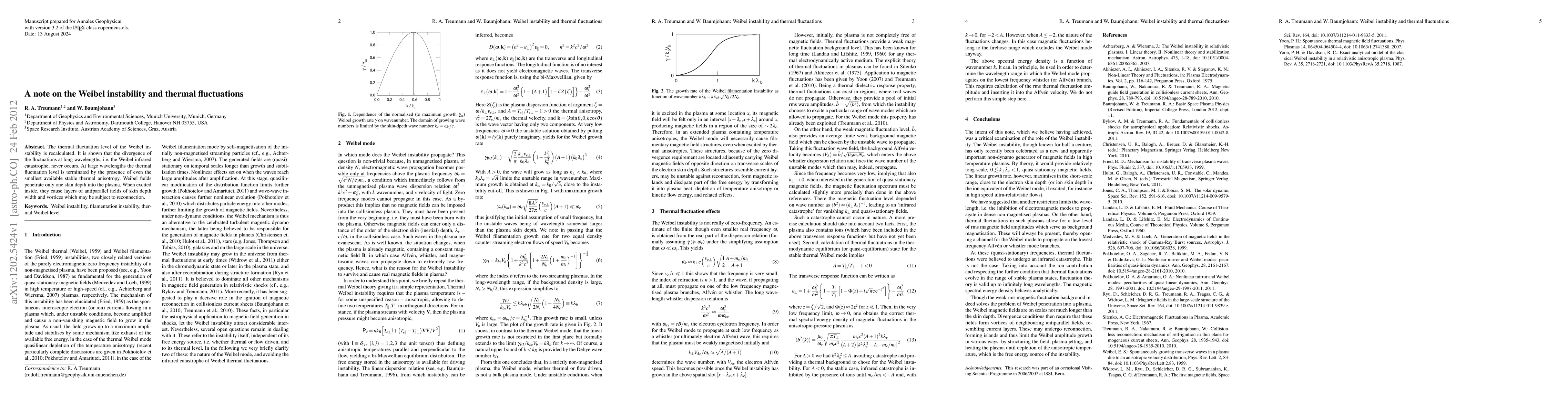 The thermal fluctuation level of the Weibel instability is recalculated. It is shown that the divergence of the fluctuations at long wavelengths, i.e. the Weibel infrared catastrophe, never occurs. At large wavelengths the thermal fluctuation level is terminated by the presence of even the smallest available stable thermal anisotropy. Weibel fields penetrate only one skin depth into the plasma. When excited inside, they cause layers of antiparallel fields of skin depth width and vortices which may be subject to reconnection.
