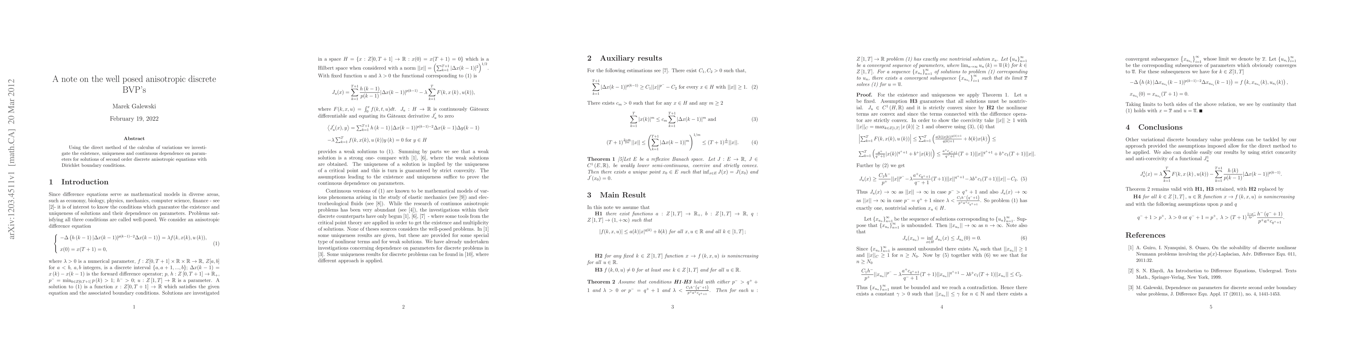 Using the direct method of the calculus of variations we investigate the existence, uniqueness and continuous dependence on parameters for solutions of second order discrete anisotropic equations with Dirichlet boundary conditions.