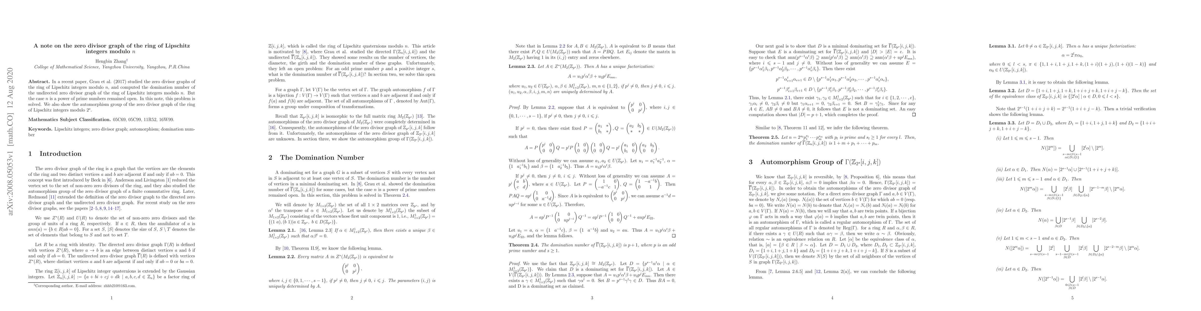 Summary: This paper resolves the open problem regarding the zero divisor graph of the ring of Lipschitz integers modulo $n$ when $n$ is a power of prime numbers, and computes the domination number. Additionally, it determines the automorphism group of the zero divisor graph for $n = 2^s$.