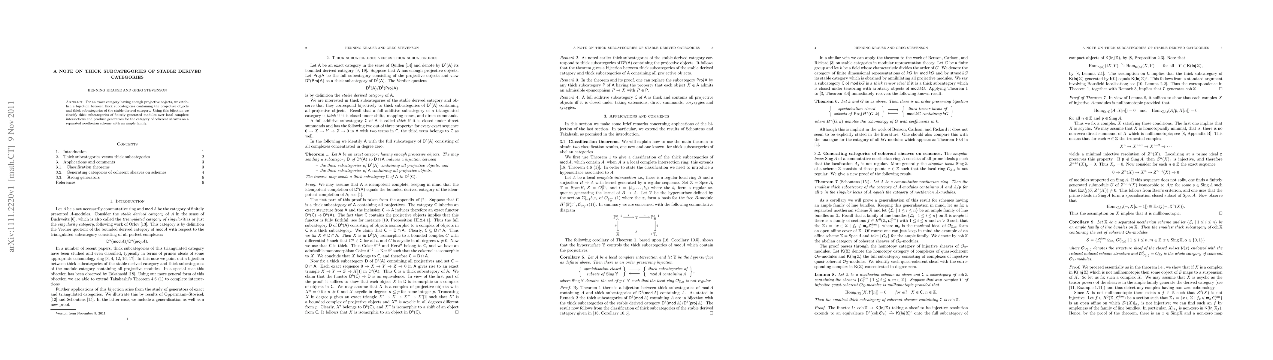 For an exact category having enough projective objects, we establish a bijection between thick subcategories containing the projective objects and thick subcategories of the stable derived category. Using this bijection we classify thick subcategories of finitely generated modules over local complete intersections and produce generators for the category of coherent sheaves on a separated noetherian scheme with an ample family.