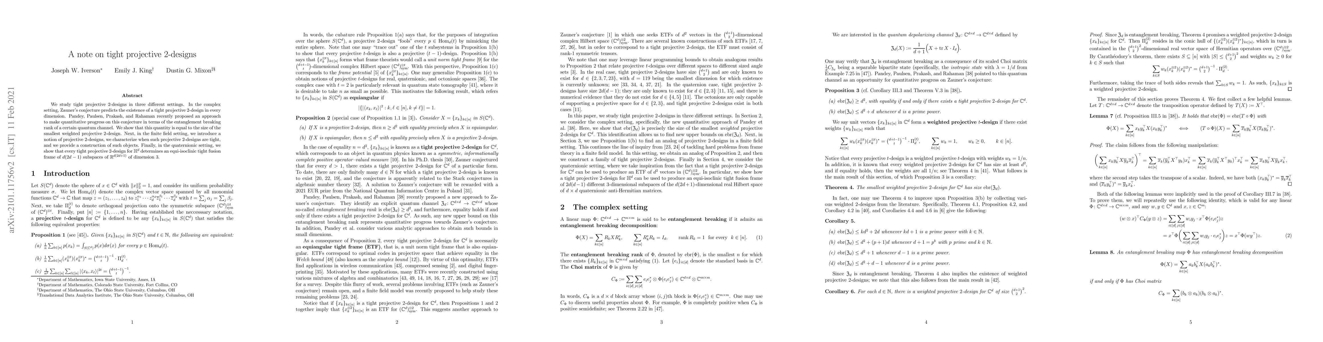 We study tight projective 2-designs in three different settings. In the complex setting, Zauner's conjecture predicts the existence of a tight projective 2-design in every dimension. Pandey, Paulsen, Prakash, and Rahaman recently proposed an approach to make quantitative progress on this conjecture in terms of the entanglement breaking rank of a certain quantum channel. We show that this quantity is equal to the size of the smallest weighted projective 2-design. Next, in the finite field setting, we introduce a notion of projective 2-designs, we characterize when such projective 2-designs are tight, and we provide a construction of such objects. Finally, in the quaternionic setting, we show that every tight projective 2-design for H^d determines an equi-isoclinic tight fusion frame of d(2d-1) subspaces of R^d(2d+1) of dimension 3.