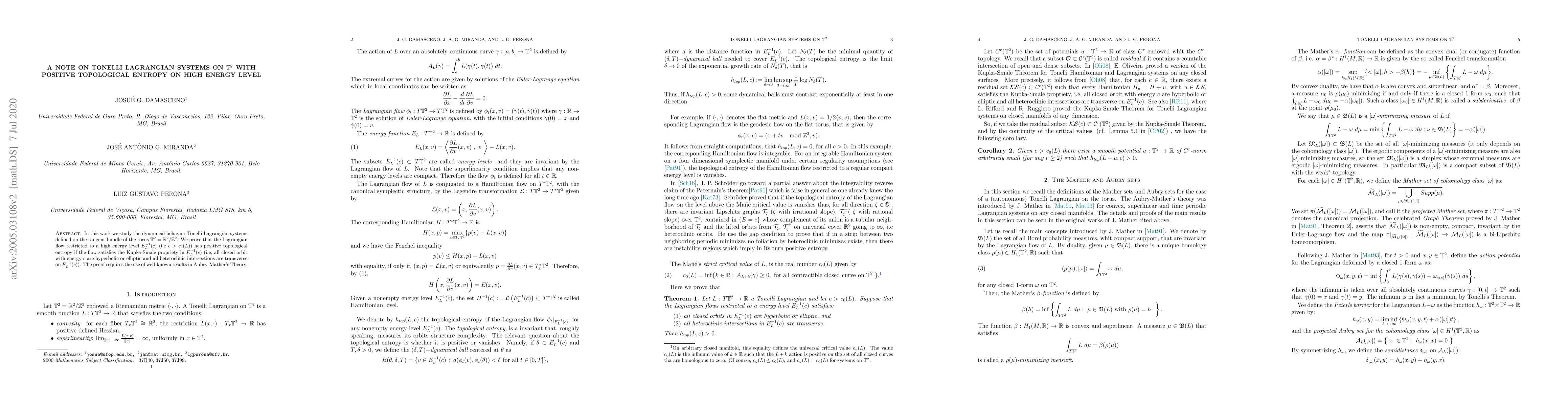 This paper investigates Tonelli Lagrangian systems on the torus $\mathbb{T}^2$ and proves that the Lagrangian flow on high energy levels exhibits positive topological entropy when it satisfies the Kupka-Smale property. The proof leverages results from Aubry-Mather theory.