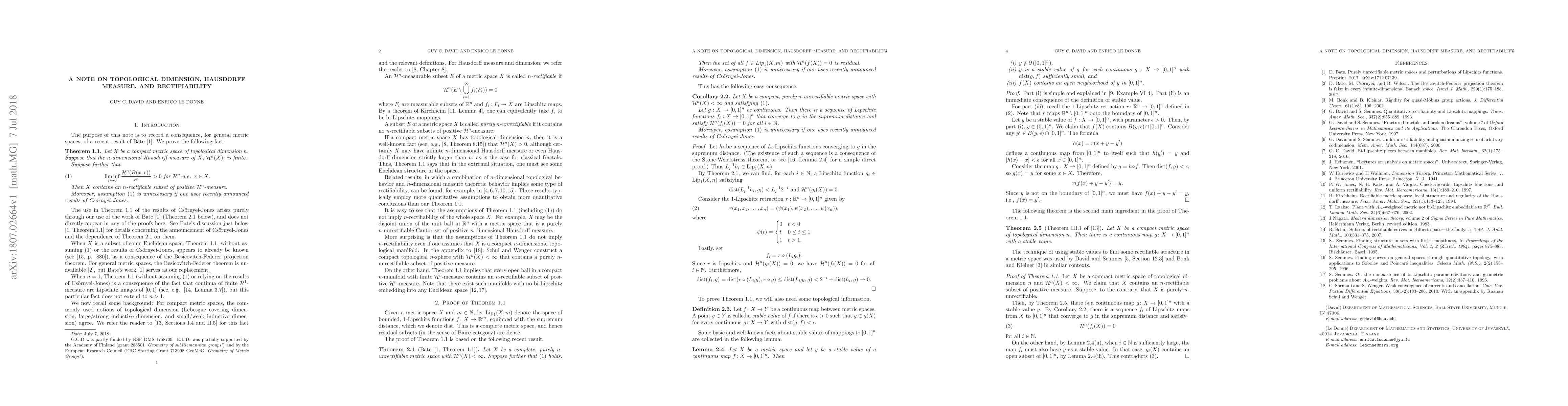 The purpose of this note is to record a consequence, for general metric spaces, of a recent result of David Bate. We prove the following fact: Let $X$ be a compact metric space of topological dimension $n$. Suppose that the $n$-dimensional Hausdorff measure of $X$, $\mathcal H^n(X)$, is finite. Suppose further that the lower n-density of the measure $\mathcal H^n$ is positive, $\mathcal H^n$-almost everywhere in $X$. Then $X$ contains an $n$-rectifiable subset of positive $\mathcal H^n$-measure. Moreover, the assumption on the lower density is unnecessary if one uses recently announced results of Cs\"ornyei-Jones.