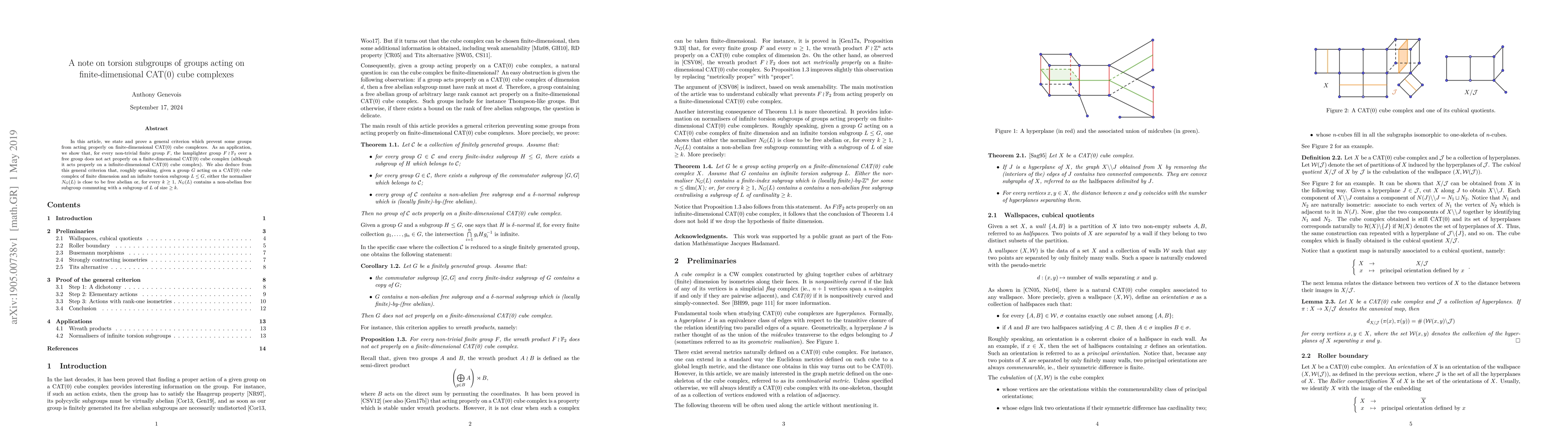 Summary: This paper provides a criterion to prevent certain groups from acting properly on finite-dimensional CAT(0) cube complexes and applies it to show that the lamplighter group $F \wr \mathbb{F}_2$ cannot act properly on such complexes. It also deduces properties of the normalizer of infinite torsion subgroups in groups acting on finite-dimensional CAT(0) cube complexes.