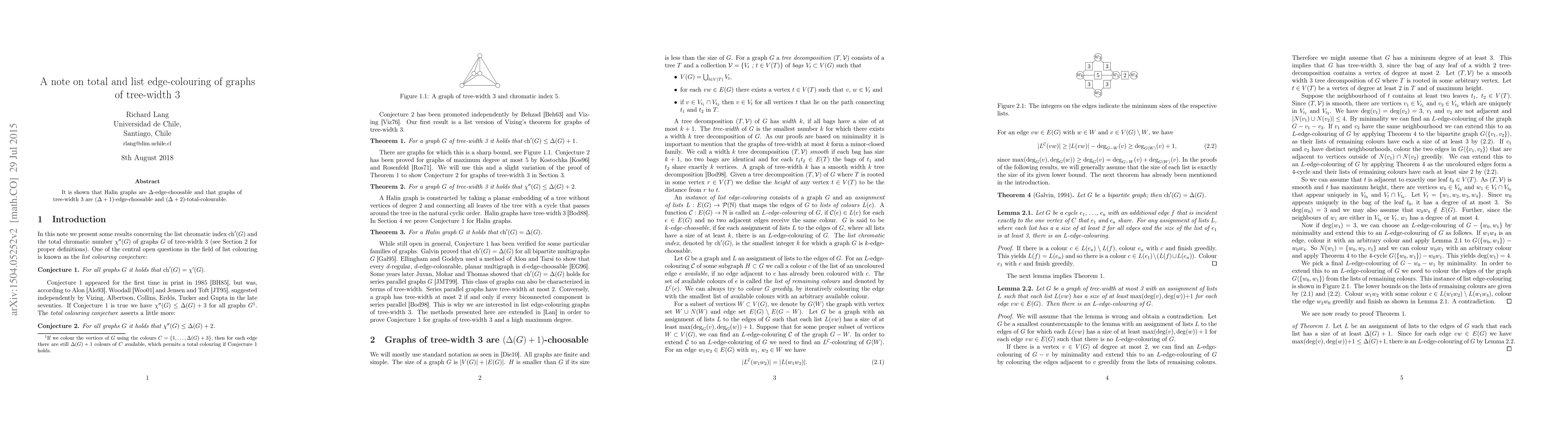 It is shown that Halin graphs are $\Delta$-edge-choosable and that graphs of tree-width 3 are $(\Delta+1)$-edge-choosable and $(\Delta +2)$-total-colourable.