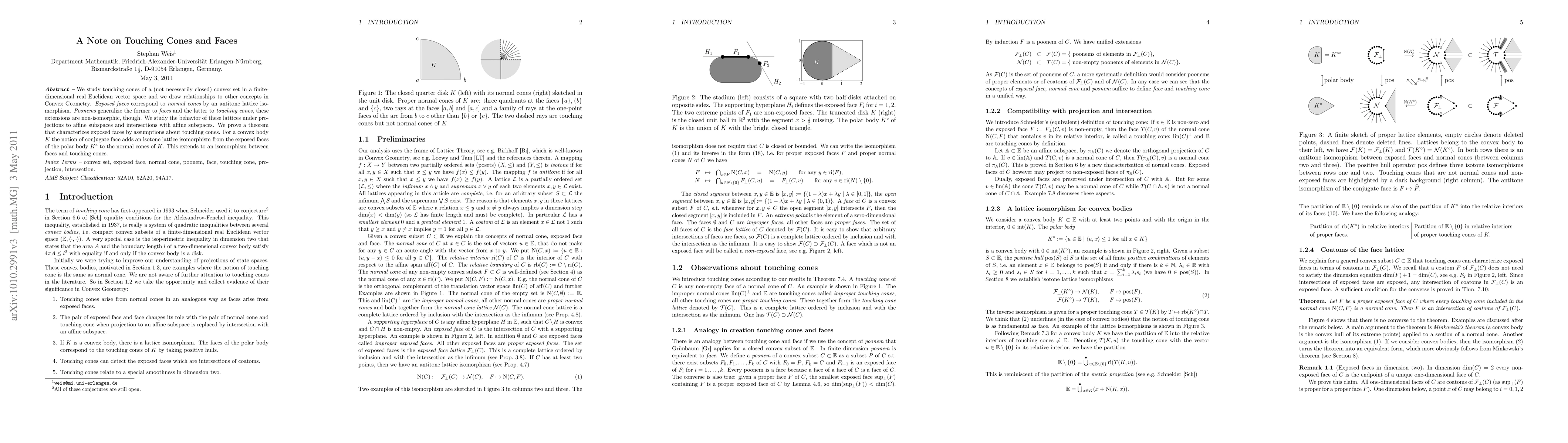 We study touching cones of a (not necessarily closed) convex set in a finitedimensional real Euclidean vector space and we draw relationships to other concepts in Convex Geometry. Exposed faces correspond to normal cones by an antitone lattice isomorphism. Poonems generalize the former to faces and the latter to touching cones, these extensions are non-isomorphic, though. We study the behavior of these lattices under projections to affine subspaces and intersections with affine subspaces. We prove a theorem that characterizes exposed faces by assumptions about touching cones. For a convex body K the notion of conjugate face adds an isotone lattice isomorphism from the exposed faces of the polar body to the normal cones of K. This extends to an isomorphism between faces and touching cones.