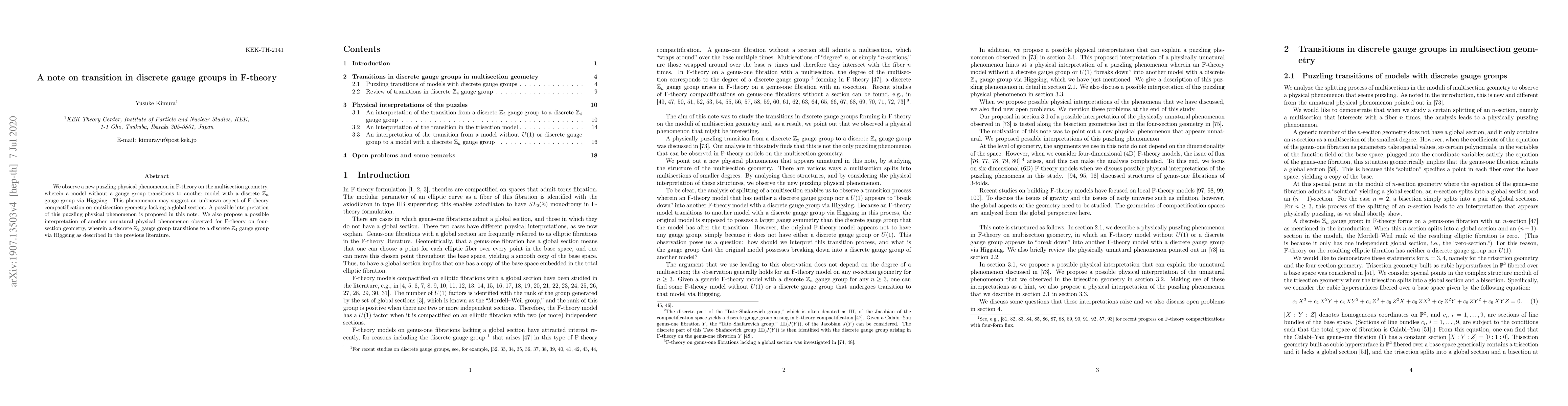 We observe a new puzzling physical phenomenon in F-theory on the multisection geometry, wherein a model without a gauge group transitions to another model with a discrete $\mathbb{Z}_n$ gauge group via Higgsing. This phenomenon may suggest an unknown aspect of F-theory compactification on multisection geometry lacking a global section. A possible interpretation of this puzzling physical phenomenon is proposed in this note. We also propose a possible interpretation of another unnatural physical phenomenon observed for F-theory on four-section geometry, wherein a discrete $\mathbb{Z}_2$ gauge group transitions to a discrete $\mathbb{Z}_4$ gauge group via Higgsing as described in the previous literature.