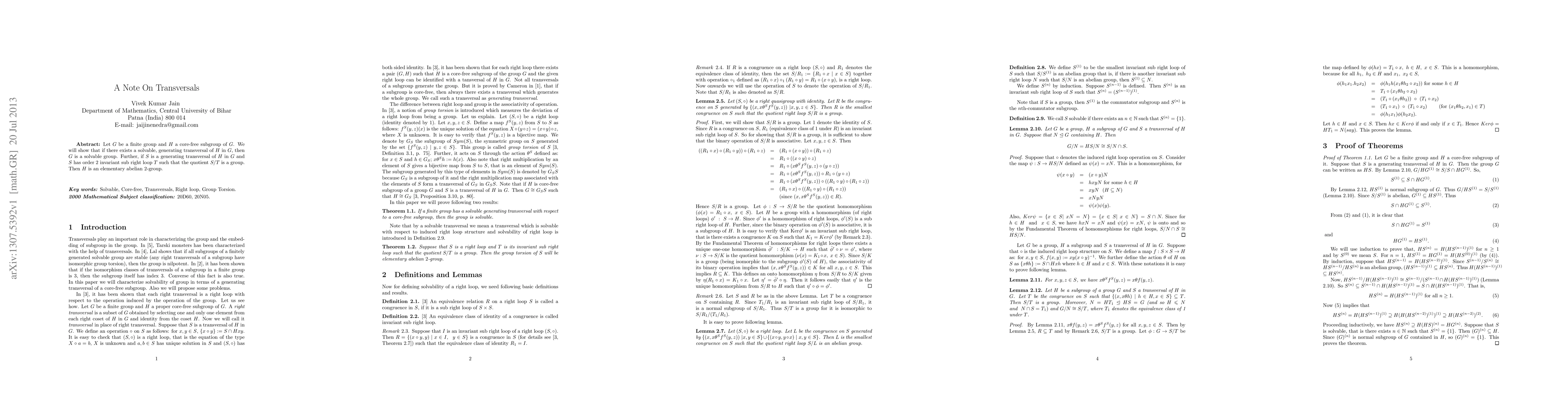Let $G$ be a finite group and $H$ a core-free subgroup of $G$. We will show that if there exists a solvable, generating transversal of $H$ in $G$, then $G$ is a solvable group. Further, if $S$ is a generating transversal of $H$ in $G$ and $S$ has order 2 invariant sub right loop $T$ such that the quotient $S/T$ is a group. Then $H$ is an elementary abelian 2-group.