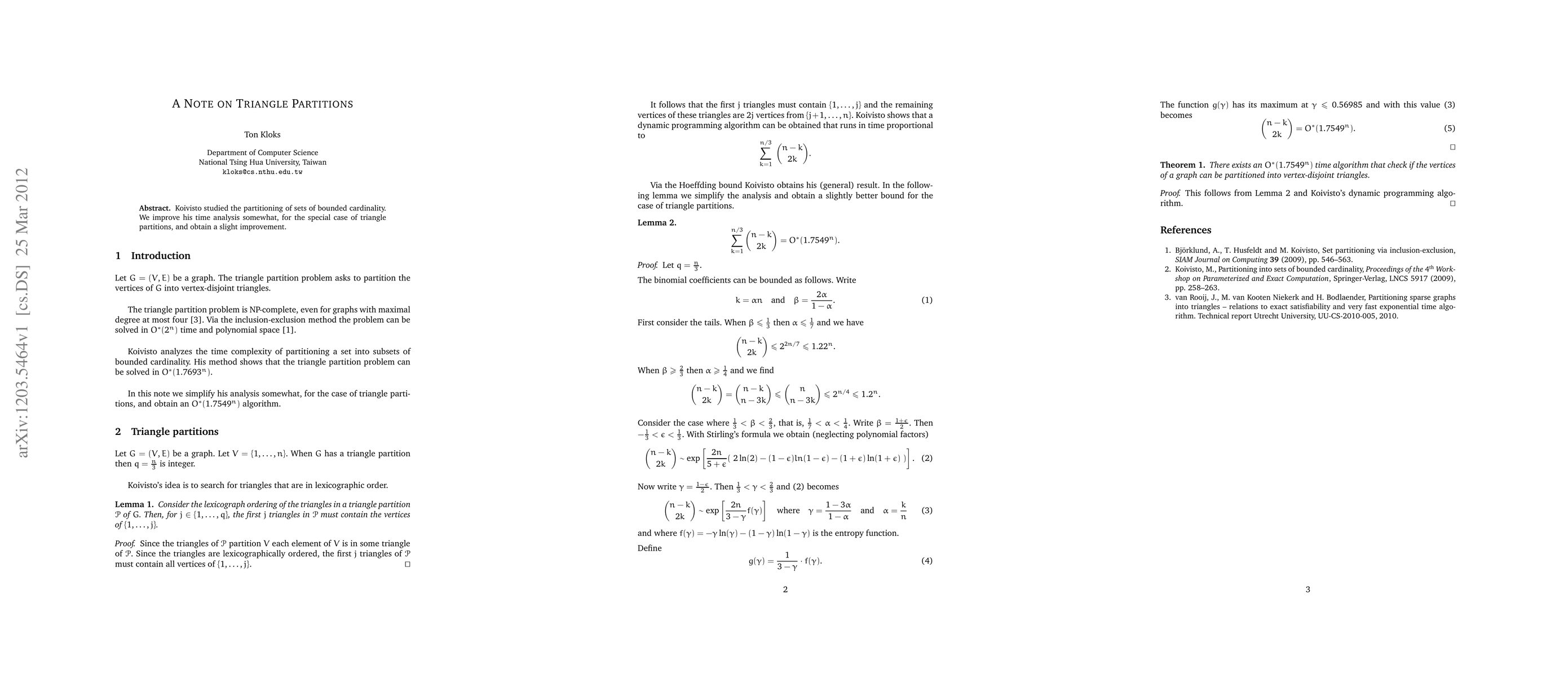 Koivisto studied the partitioning of sets of bounded cardinality. We improve his time analysis somewhat, for the special case of triangle partitions, and obtain a slight improvement.
