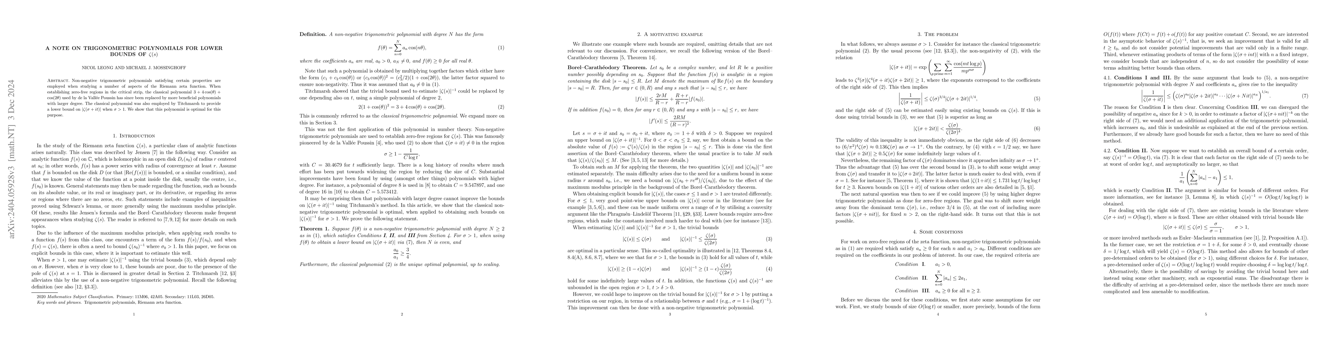 Non-negative trigonometric polynomials satisfying certain properties are employed when studying a number of aspects of the Riemann zeta function. When establishing zero-free regions in the critical strip, the classical polynomial $3+4\cos(\theta)+\cos(2\theta)$ used by de la Vall\'ee Poussin has since been replaced by more beneficial polynomials with larger degree. The classical polynomial was also employed by Titchmarsh to provide a lower bound on $|\zeta(\sigma+it)|$ when $\sigma>1$. We show that this polynomial is optimal for this purpose.