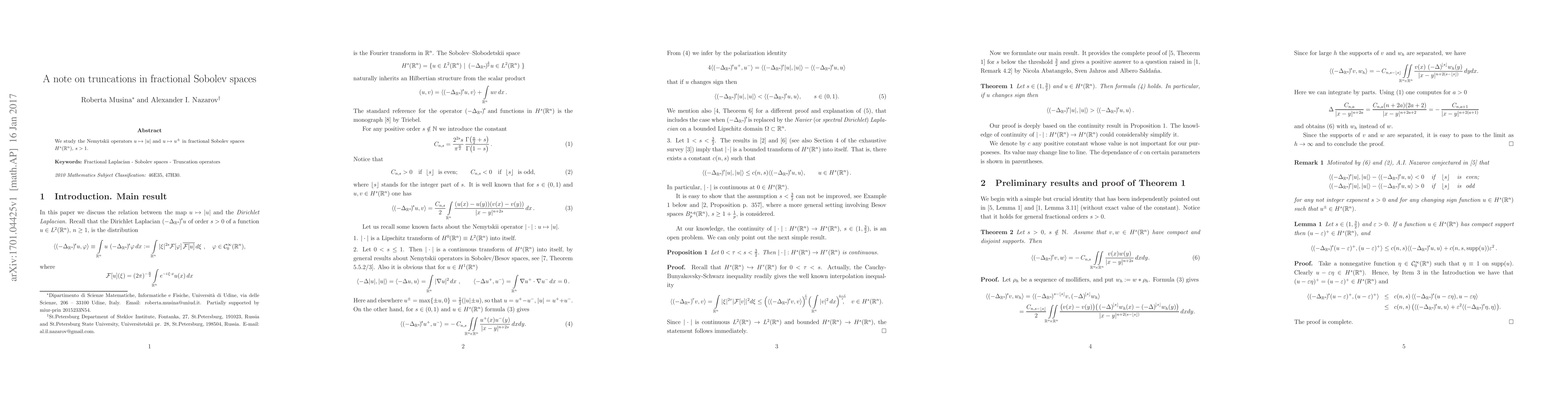 Summary: This paper investigates the behavior of Nemytskii operators applied to absolute and positive/negative truncations within fractional Sobolev spaces $H^s(\mathbb R^n)$ for $s>1$, focusing on their properties and implications.
