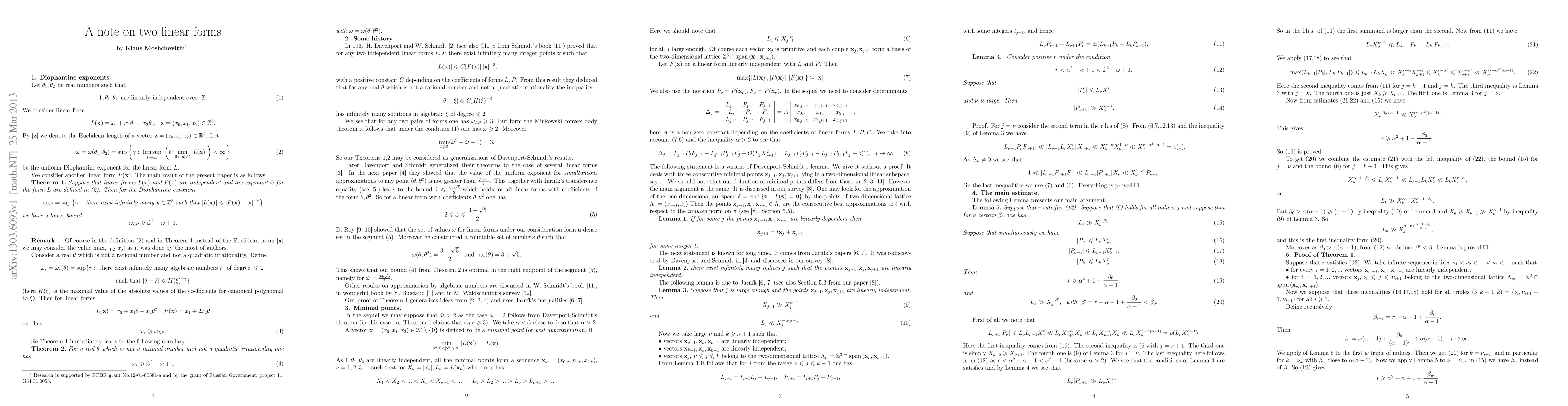 We prove a result on approximations to a real number $\theta$ by algebraic numbers of degree $\le 2$ in the case when we have information about the uniform Diophantine exponent $\hat{\omega}$ for the linear form $x_0 +\theta x_1+\theta^2x_2$.