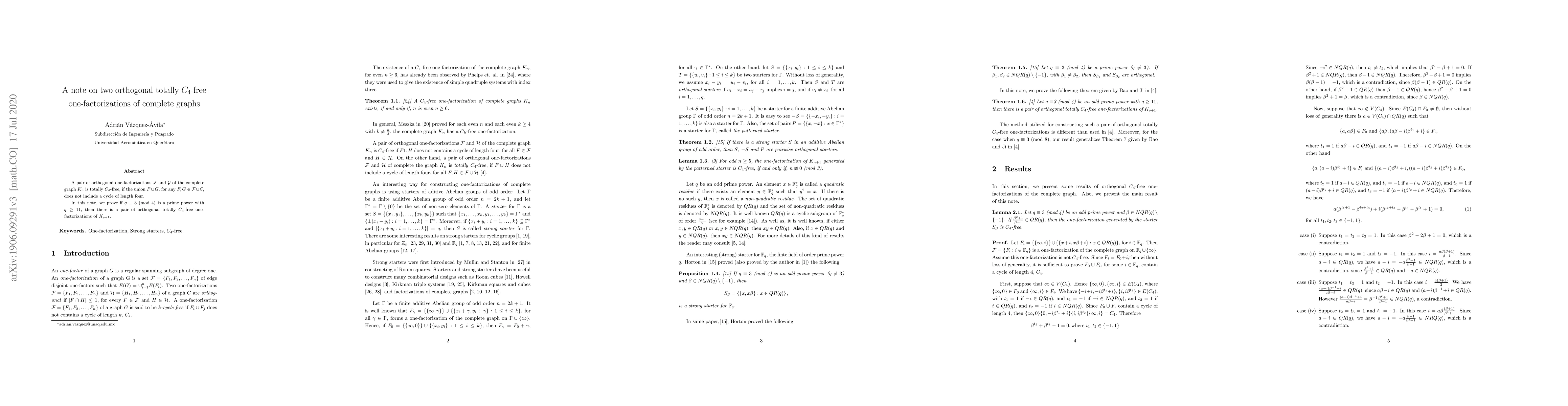 This paper proves the existence of two orthogonal totally $C_4$-free one-factorizations of the complete graph $K_{q+1}$ when $q$ is a prime power congruent to 3 modulo 4 and greater than or equal to 11. Such factorizations ensure that no cycle of length four is formed when combining any two one-factors from the pair.