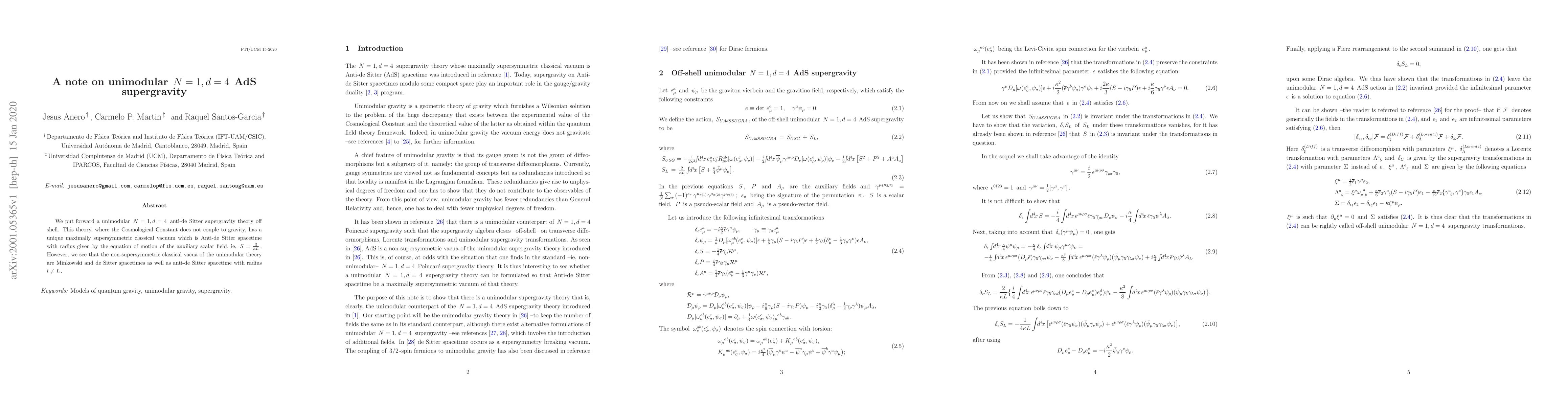 We put forward a unimodular $N=1, d=4$ anti-de Sitter supergravity theory off shell. This theory, where the Cosmological Constant does not couple to gravity, has a unique maximally supersymmetric classical vacuum which is Anti-de Sitter spacetime with radius given by the equation of motion of the auxiliary scalar field, ie, $S=\frac{3}{\kappa L}$. However, we see that the non-supersymmetric classical vacua of the unimodular theory are Minkowski and de Sitter spacetimes as well as anti-de Sitter spacetime with radius $l\neq L$.