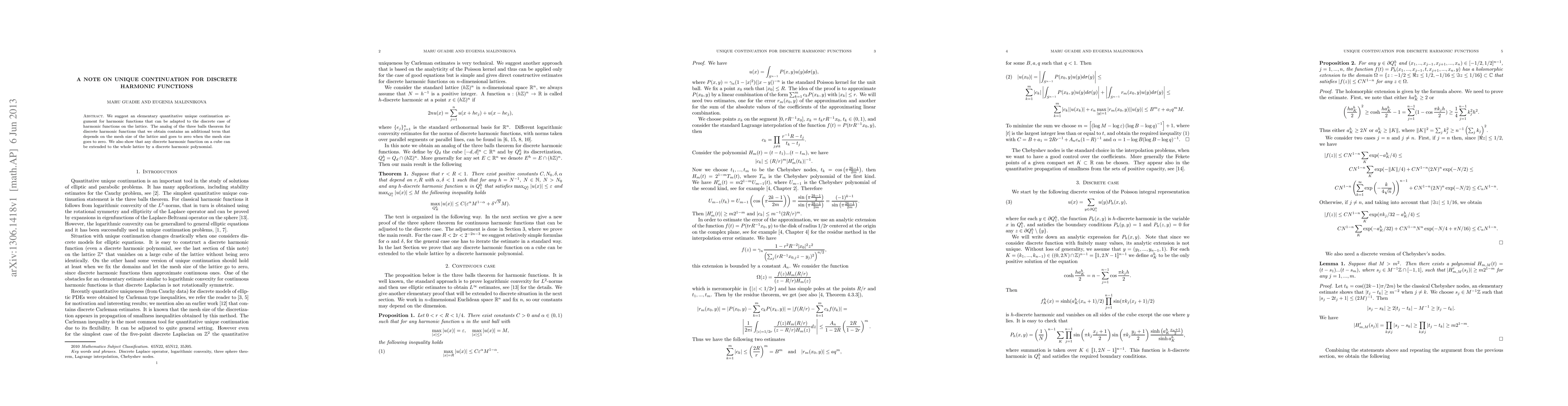 Summary: This paper presents a quantitative unique continuation property for discrete harmonic functions on lattices, demonstrating that they can vanish on a large cube without being zero everywhere, while also establishing a discrete analogue of the three balls theorem.