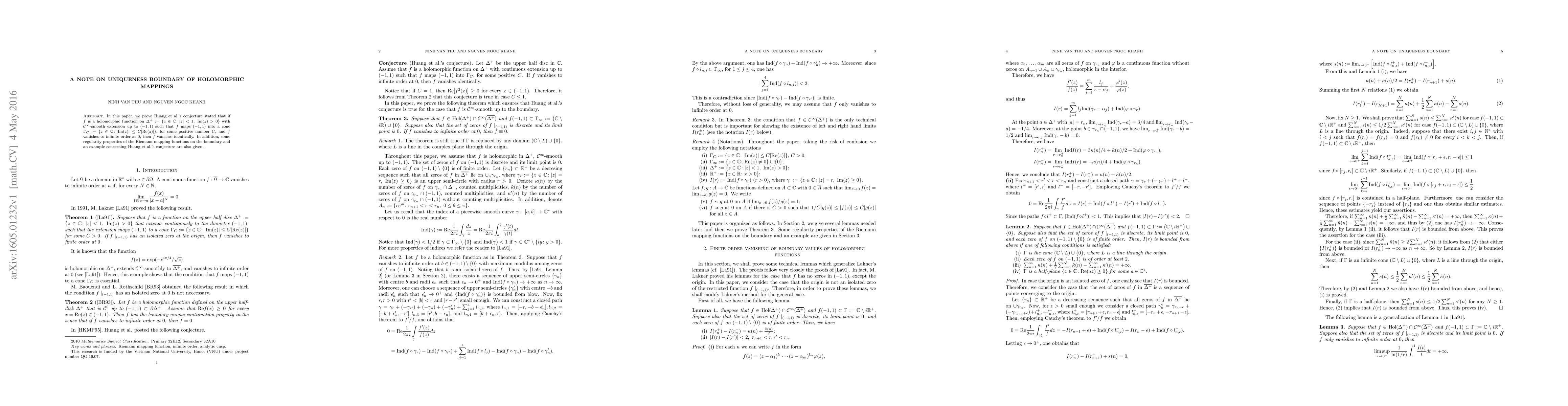 In this paper, we prove Huang et al.'s conjecture stated that if $f$ is a holomorphic function on $\Delta^+:=\{z\in \mathbb C \colon |z|<1,~\mathrm{Im}(z)>0\}$ with $\mathcal{C}^\infty$-smooth extension up to $(-1,1)$ such that $f$ maps $(-1,1)$ into a cone $\Gamma_C:=\{z\in \mathbb C\colon |\mathrm{Im} (z)| \leq C|\mathrm{Re} (z)|\}$, for some positive number $C$, and $f$ vanishes to infinite order at $0$, then $f$ vanishes identically. In addition, some regularity properties of the Riemann mapping functions on the boundary and an example concerning Huang et al.'s conjecture are also given.