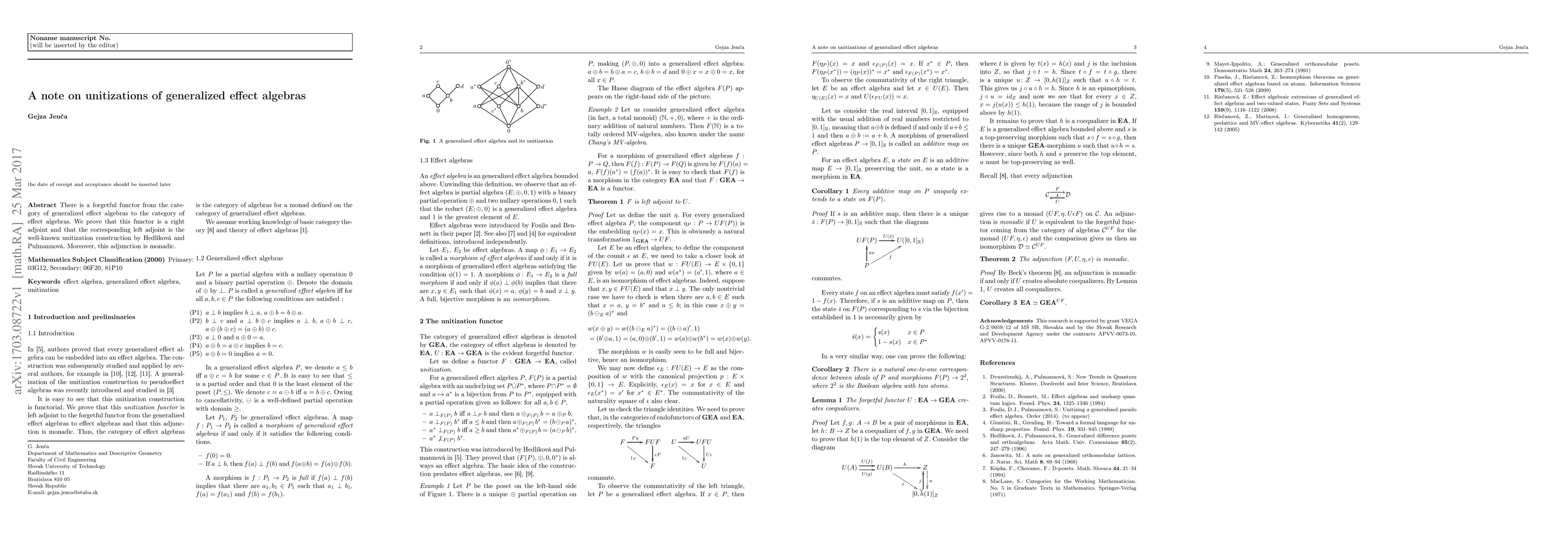 Researchers prove that a forgetful functor from generalized effect algebras to effect algebras is a right adjoint with a well-known left adjoint, and that this adjunction is monadic, providing insight into the relationship between these algebraic structures.
