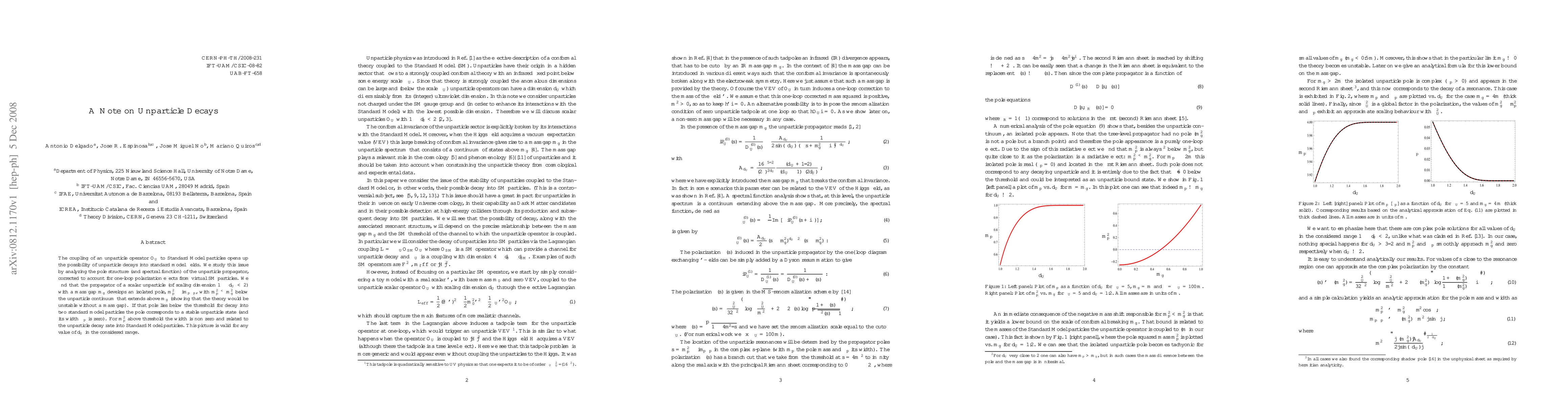 The coupling of an unparticle operator O_U to Standard Model particles opens up the possibility of unparticle decays into standard model fields. We study this issue by analyzing the pole structure (and spectral function) of the unparticle propagator, corrected to account for one-loop polarization effects from virtual SM particles. We find that the propagator of a scalar unparticle (of scaling dimension 1 < d_U < 2) with a mass gap m_g develops an isolated pole, m_p^2-i m_p Gamma_p, with m_p^2 < m_g^2 below the unparticle continuum that extends above m_g (showing that the theory would be unstable without a mass gap). If that pole lies below the threshold for decay into two standard model particles the pole corresponds to a stable unparticle state (and its width Gamma_p is zero). For m_p^2 above threshold the width is non zero and related to the unparticle decay rate into Standard Model particles. This picture is valid for any value of d_U in the considered range.