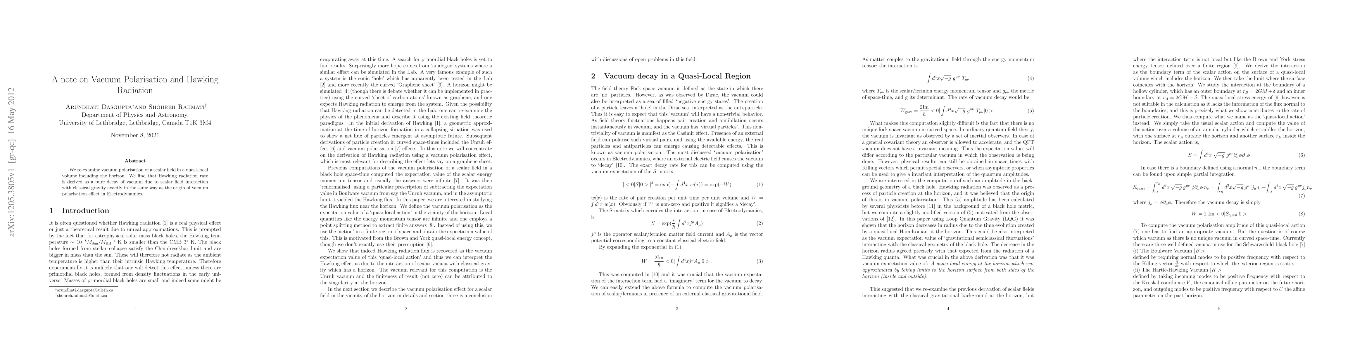 We re-examine vacuum polarisation of a scalar field in a quasi-local volume including the horizon. We find that Hawking radiation rate is derived as a pure decay of vacuum due to scalar field interaction with classical gravity exactly in the same way as the origin of vacuum polarisation effect in Electrodynamics.