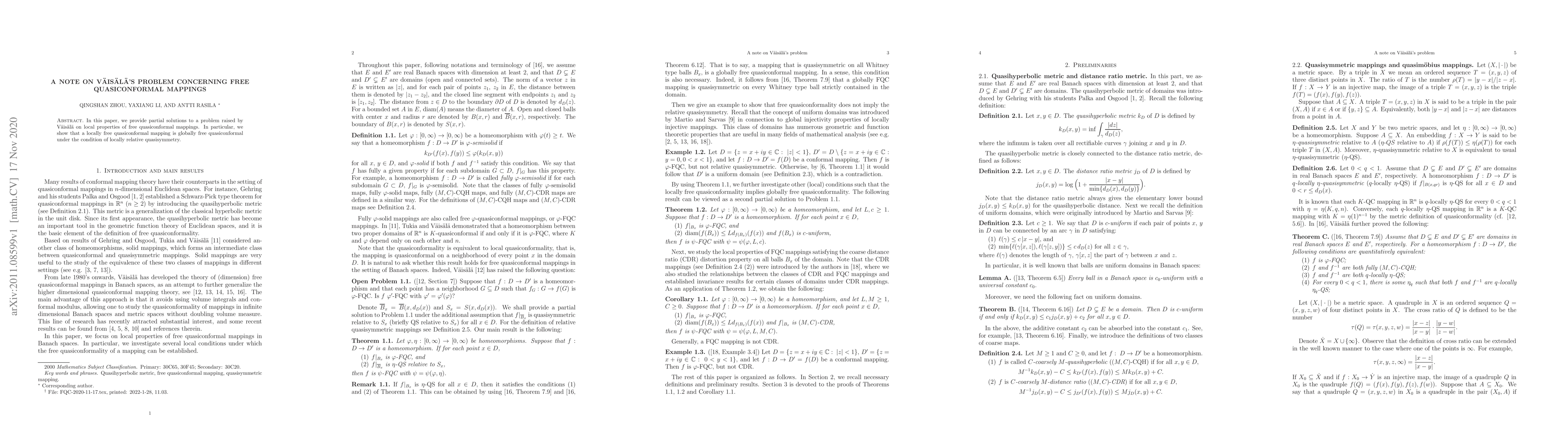 In this paper, we provide partial solutions to a problem raised by V\"ais\"al\"a on local properties of free quasiconformal mappings. In particular, we show that a locally free quasiconformal mapping is globally free quasiconformal under the condition of locally relative quasisymmetry.
