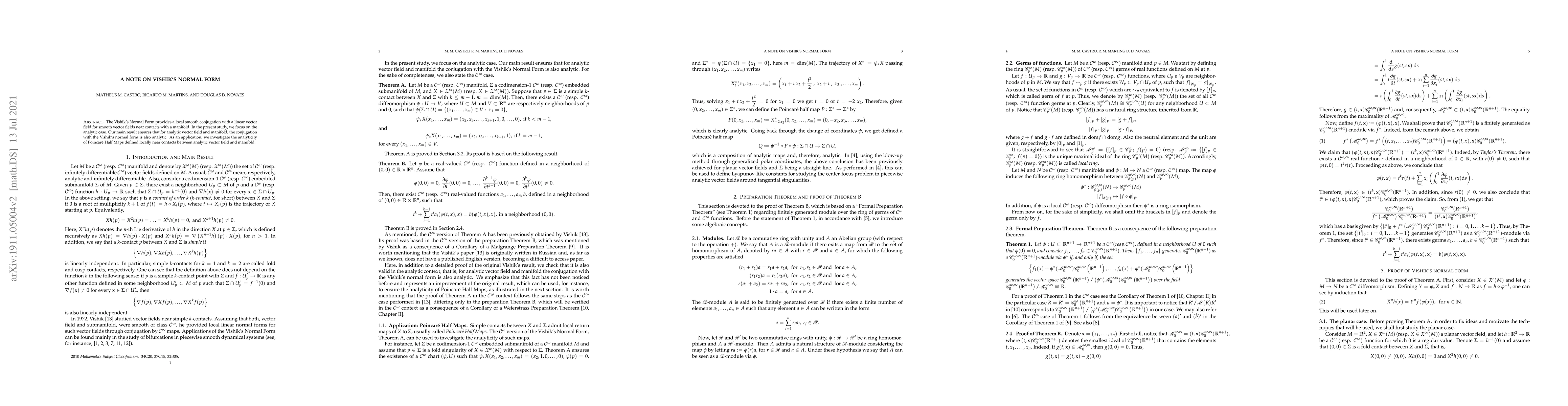 The Vishik's Normal Form provides a local smooth conjugation with a linear vector field for smooth vector fields near contacts with a manifold. In the present study, we focus on the analytic case. Our main result ensures that for analytic vector field and manifold, the conjugation with the Vishik's normal form is also analytic. As an application, we investigate the analyticity of Poincar\'e Half Maps defined locally near contacts between analytic vector field and manifold.
