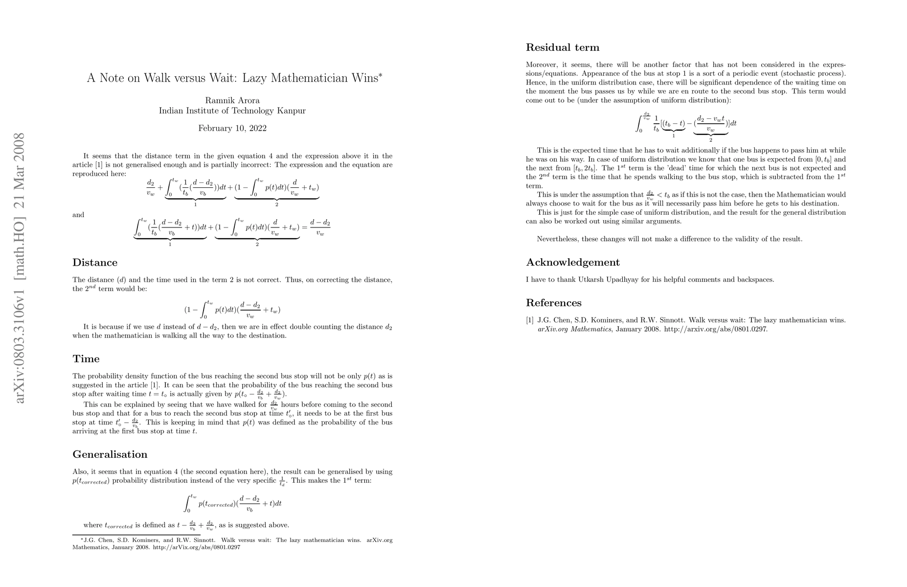 This paper identifies and corrects several mathematical errors in the original work "Walk versus wait: The lazy mathematician wins" by J.G. Chen, S.D. Kominers, and R.W. Sinnott, which originally analyzed the optimal strategy between walking and waiting in a cost-benefit framework. The author provides a revised version with accurate calculations and conclusions.